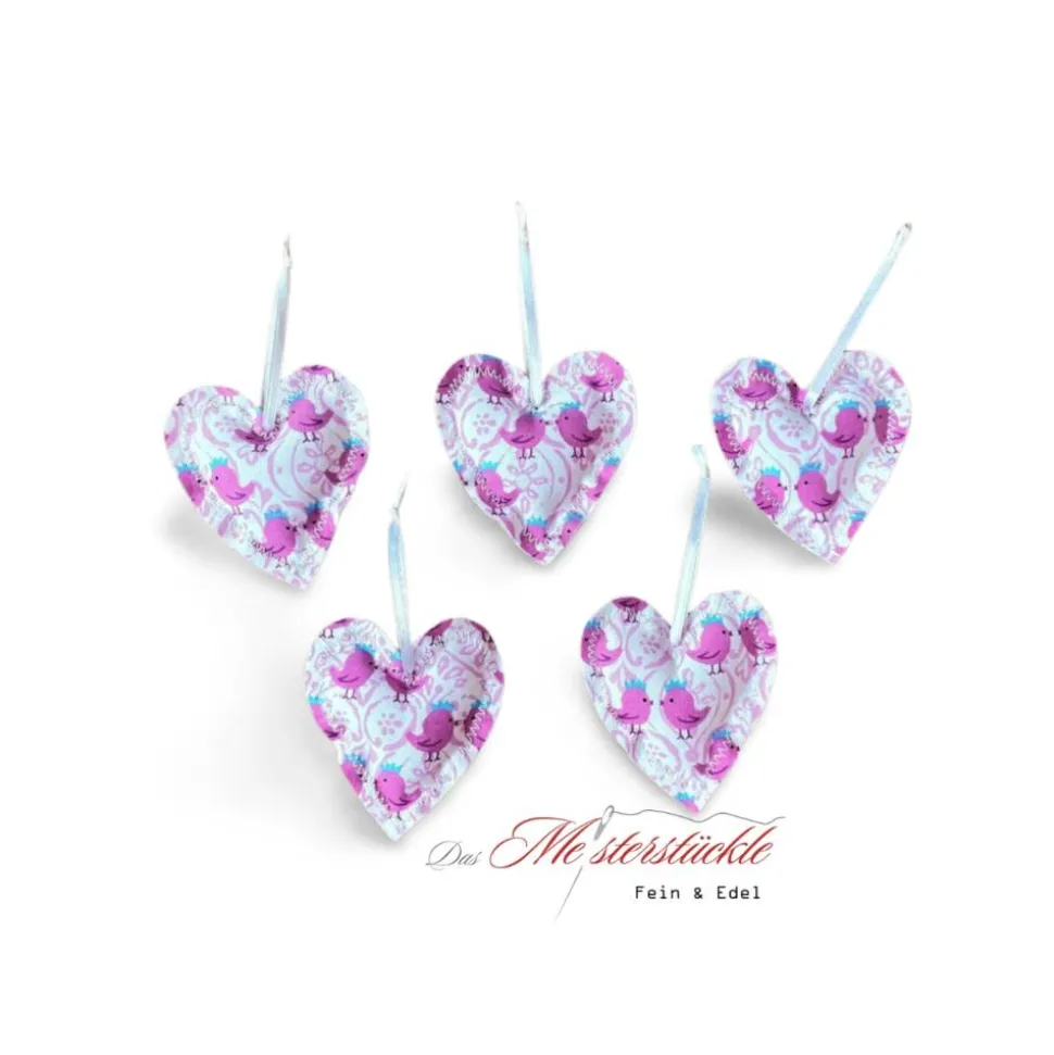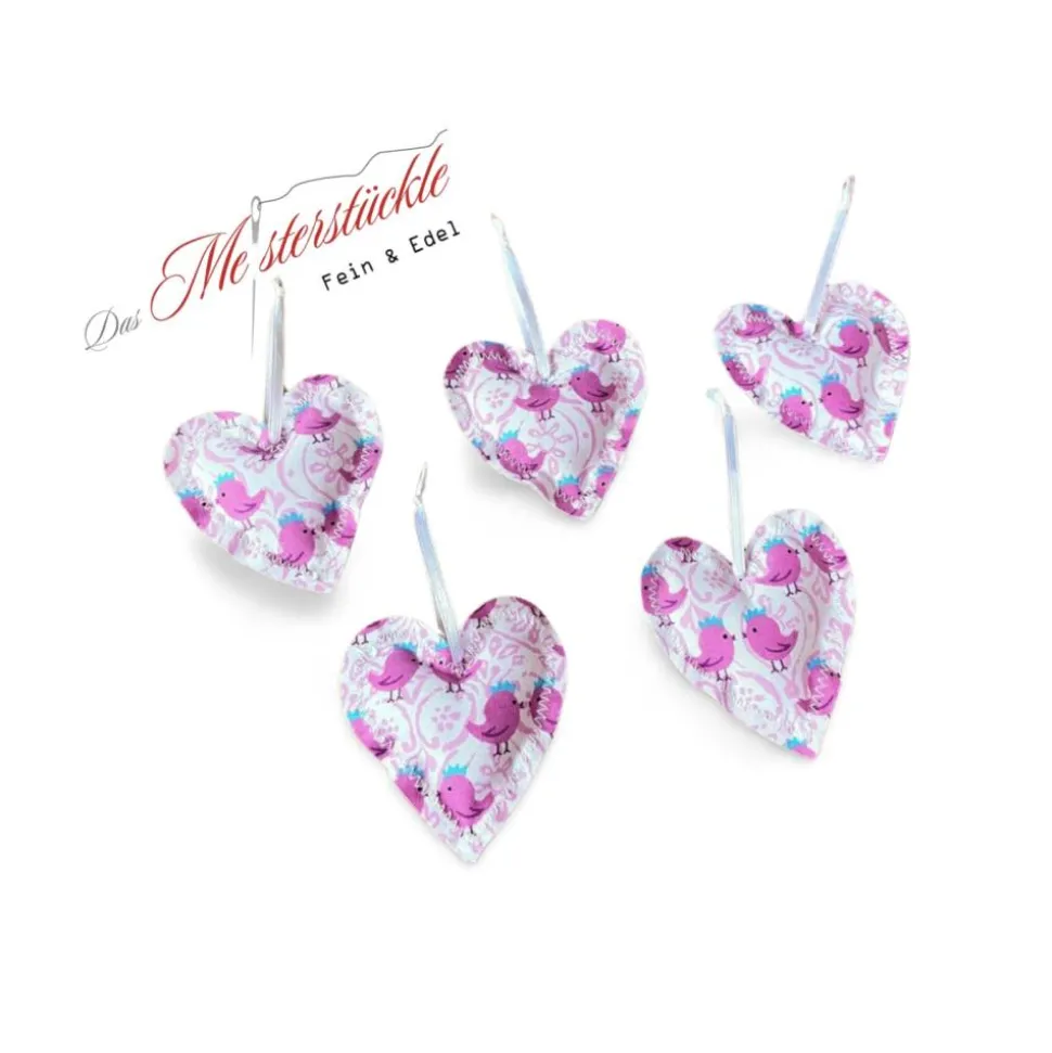* 5-er Set kleine Stoffherzchen mit Vogelmotiv