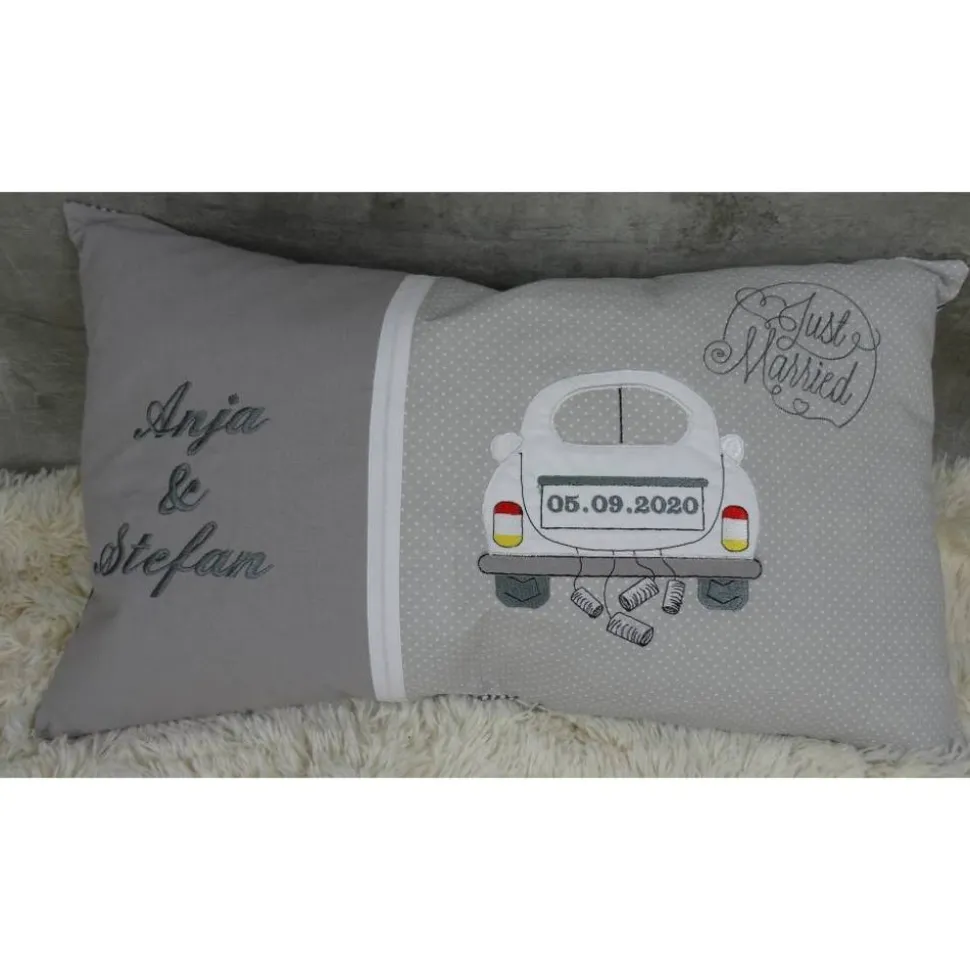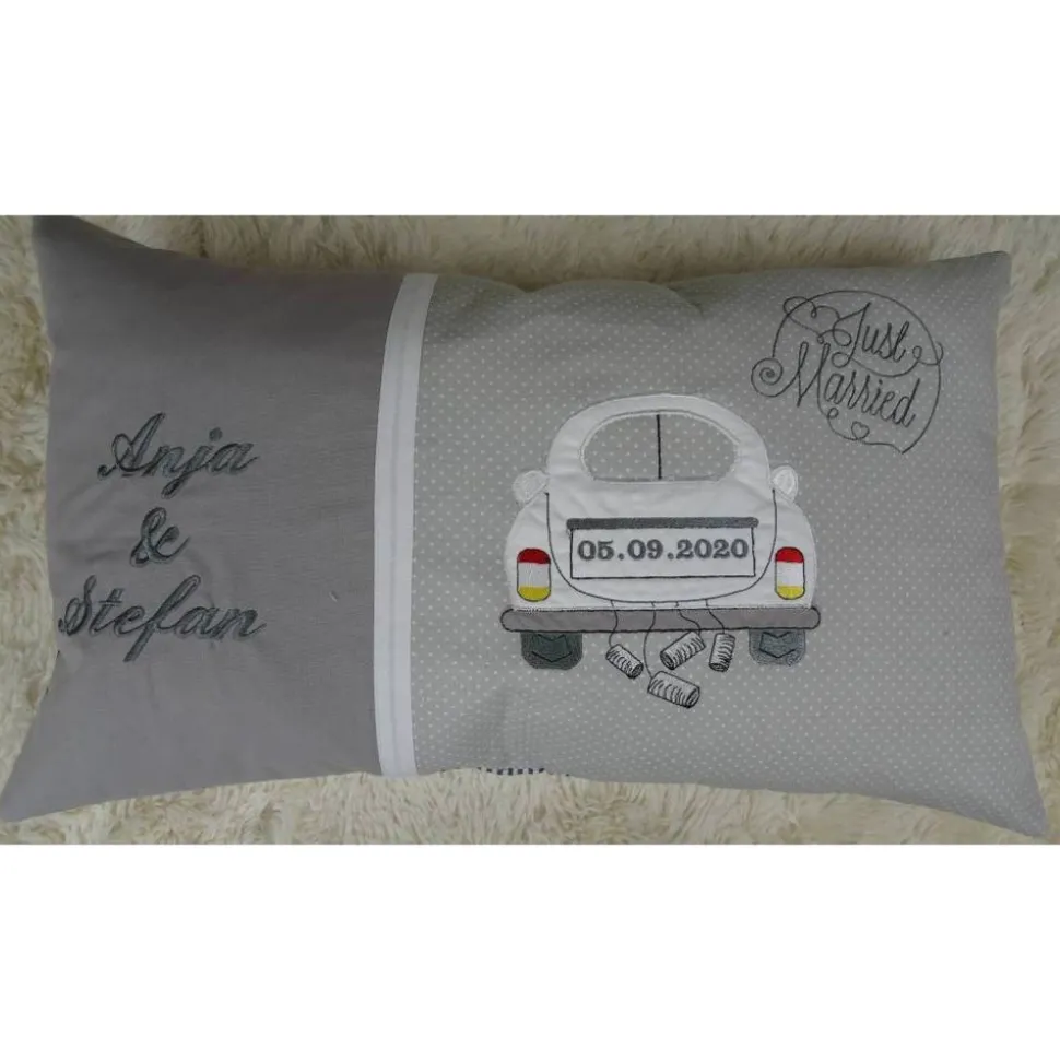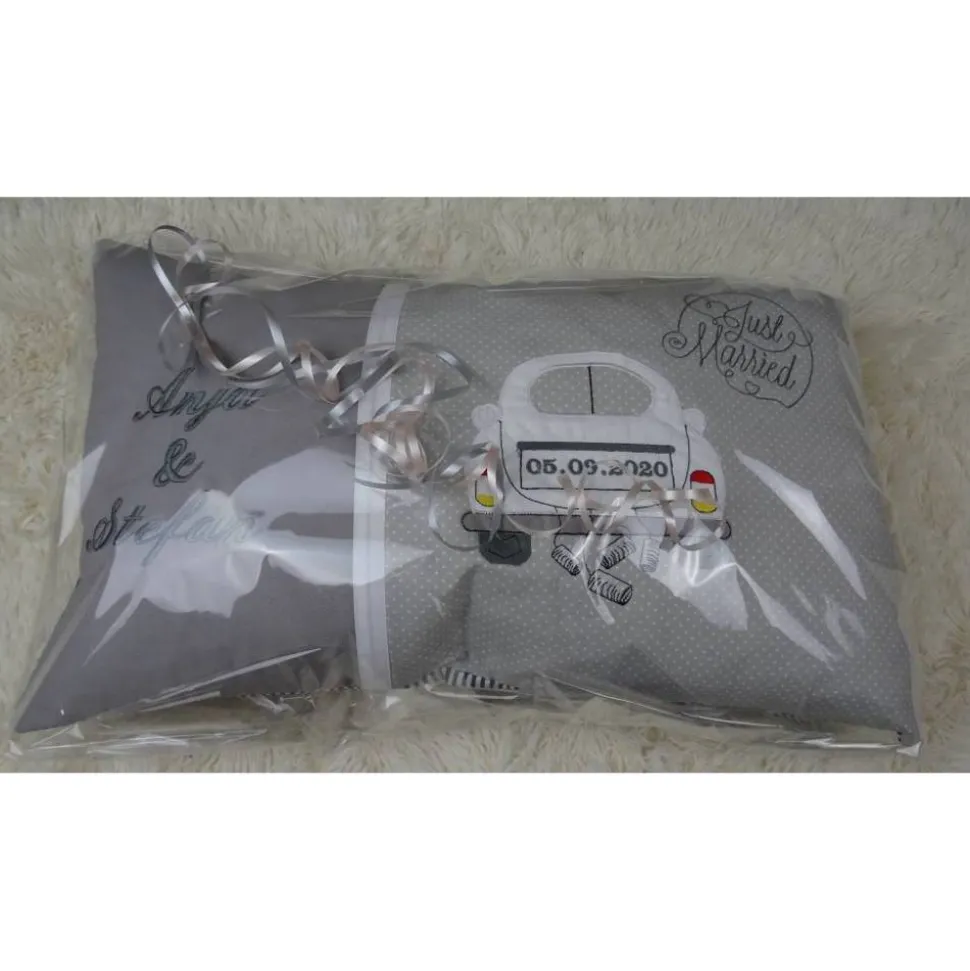 Liebevoll mit einem applizierten Auto und den Hochzeitsdaten bestickt, machen das Kissen einzigartig.Die verwendete Stickdatei ist von