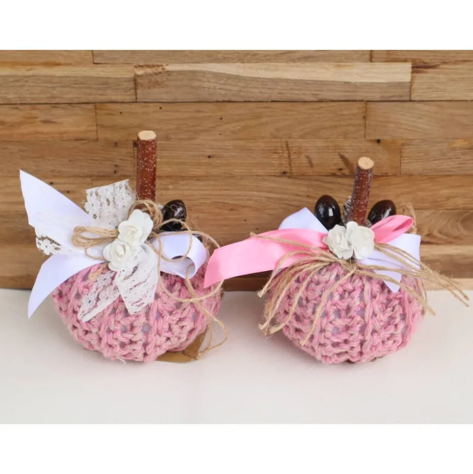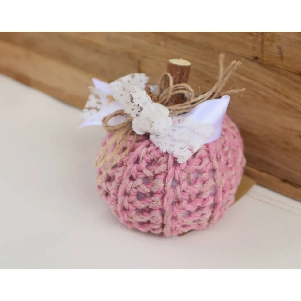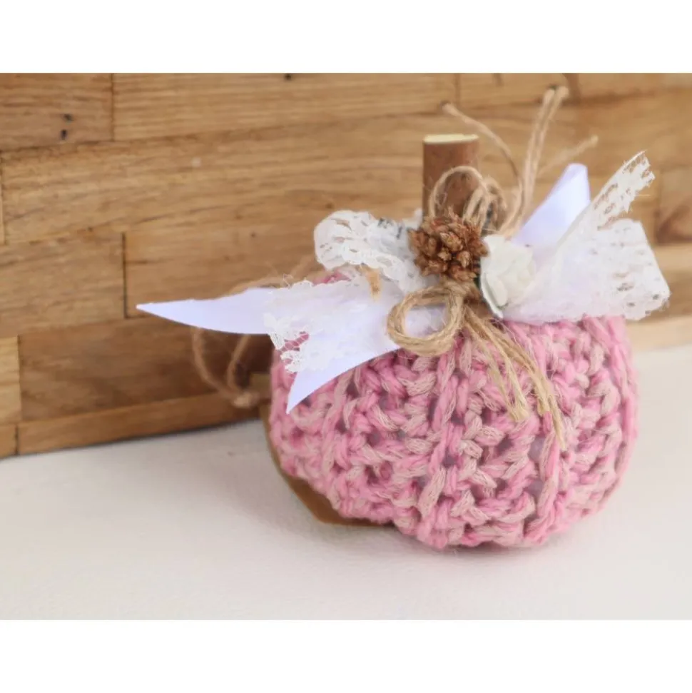 Süßer gehäkelter Dekokürbis in rosa Tönen. Den Kürbis habe ich oben mit verschiedenen Materialien dekoriert und zum Abschluß noch eine hübsche Schleife befestigt.