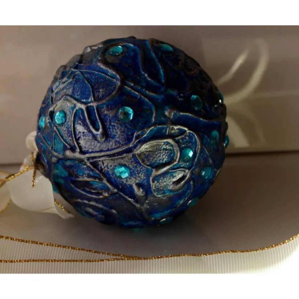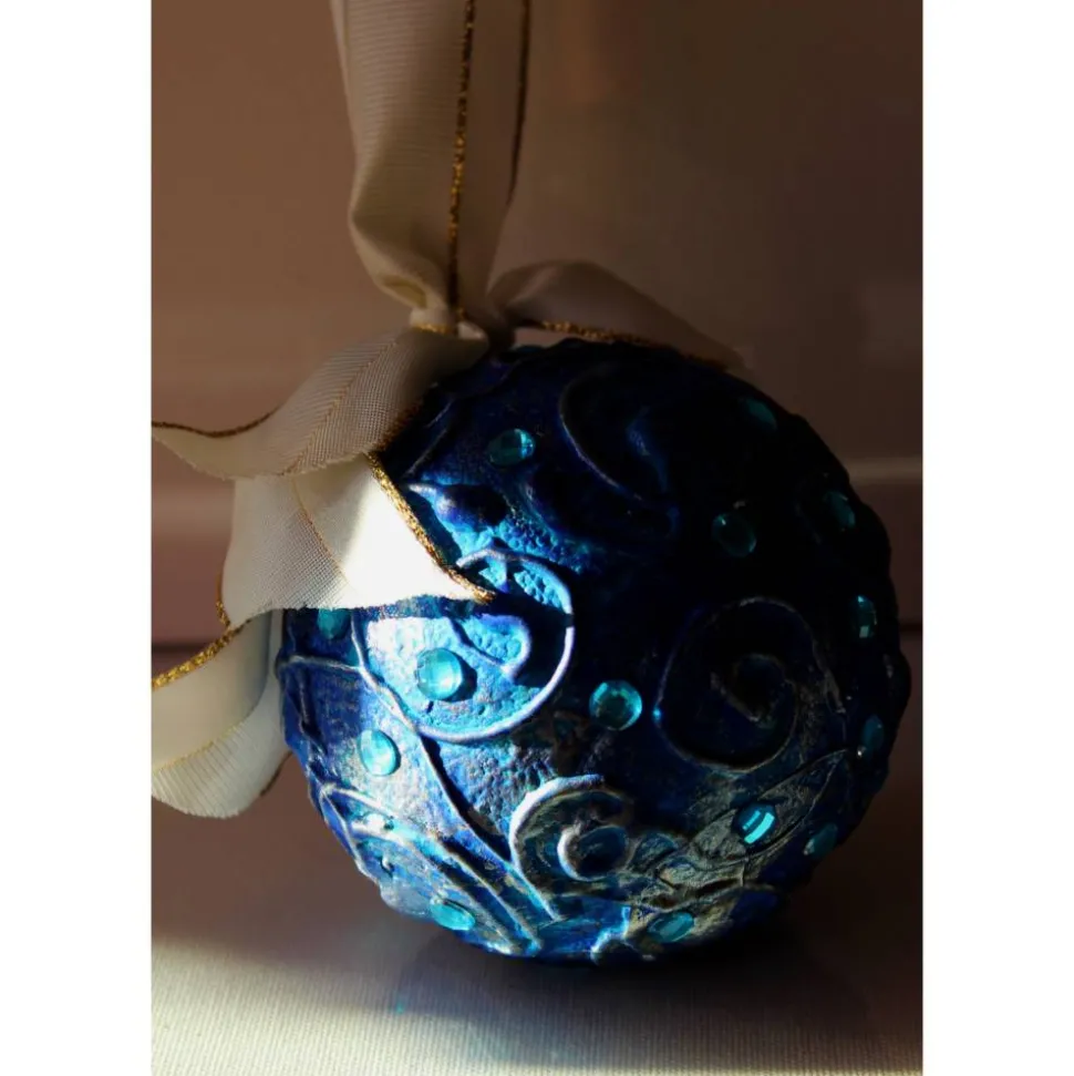 Gestaltet aus einer Styroporkugel. Bemalt mit Acrylfarben in Blau, Türkis und Silber. Dekoriert mit Glitzersteinen. Das Band ist an einem Haken befestigt, kann nach belieben ausgetauscht werden.