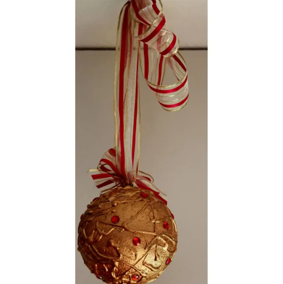 Gestaltet aus einer Styroporkugel.Handbemalt mit Acrylfarben in Gold. Dekoriert mit Glitzersteinchen.