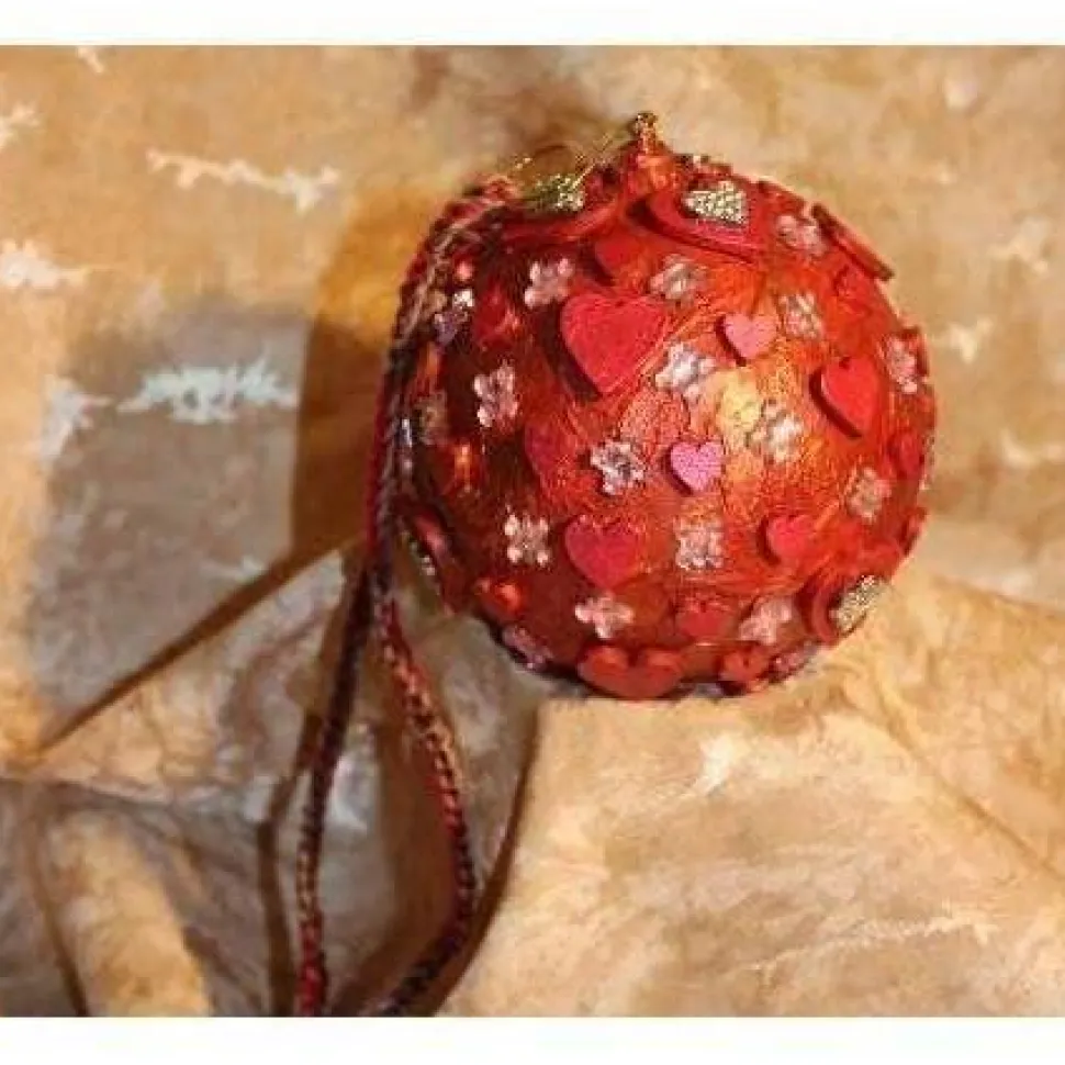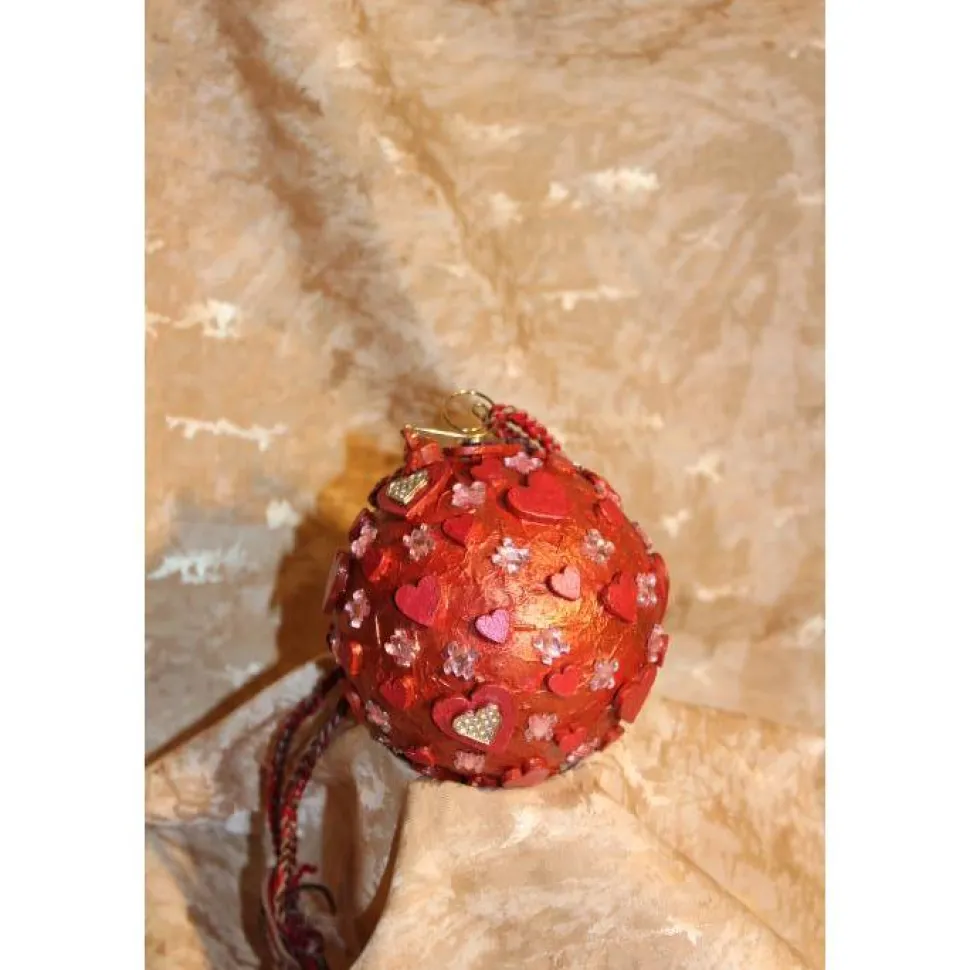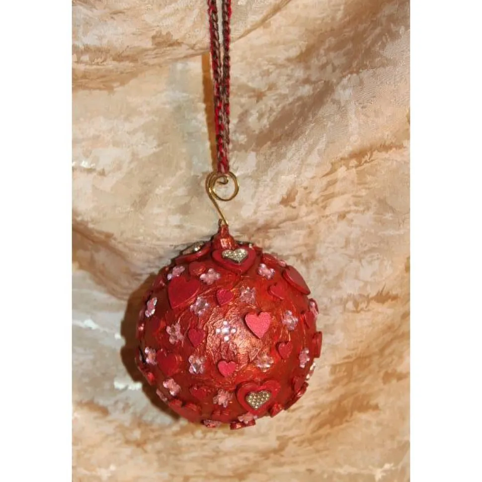 Gestaltet aus einer Kunststoffkugel. Bemalt mit Acrylfarben in Rot und Rosarot. Dekoriert mit schillernden Glitzersteinen, Holz- und Metallherzen. An der Kugel ist ein kleiner, goldfarbener Zierhaken angebracht. Als Aufhängung wird ein gehäkeltes Bändchen mitgeliefert.