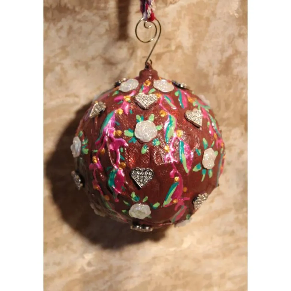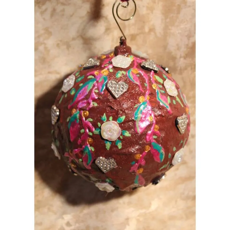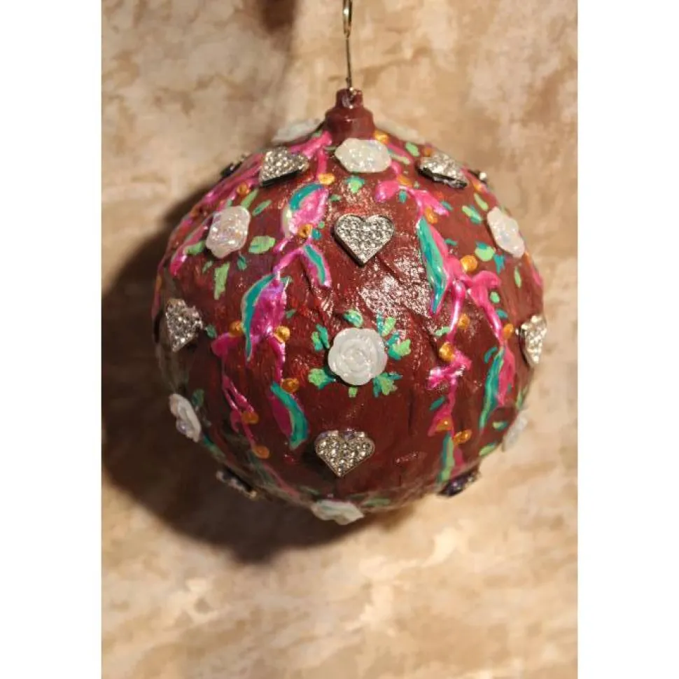 Gestaltet aus einer Kunststoffkugel. Bemalt mit Acrylfarben in Bordeaux, Pink und Grün. Dekoriert mit irisierenden Rosen in weiß und glitzernden Metallherzen. An der Kugel ist ein kleiner, goldfarbener Zierhaken angebracht. Als Aufhängung wird ein gehäkeltes Bändchen in passenden Farben mitgeliefert.