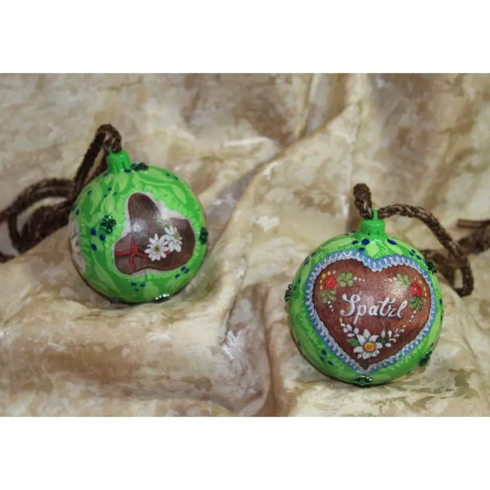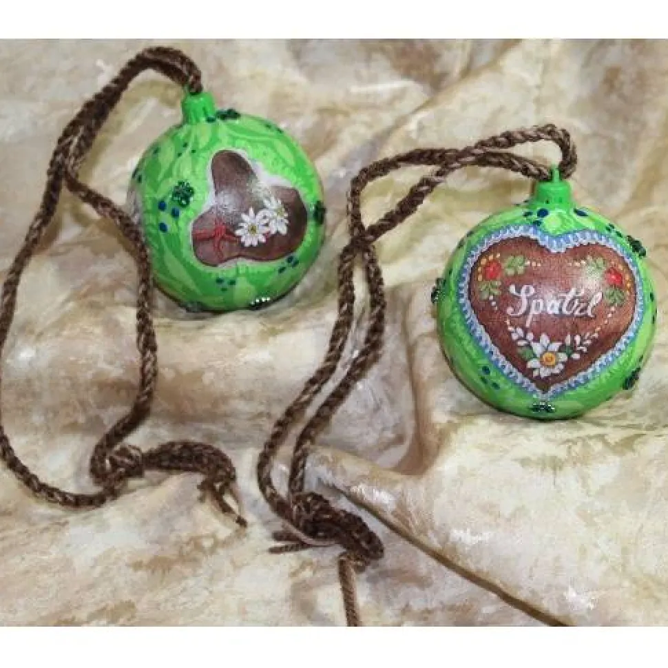 An beiden Kugeln ist ein gehäkeltes Bändchen aus Wolle angebracht.