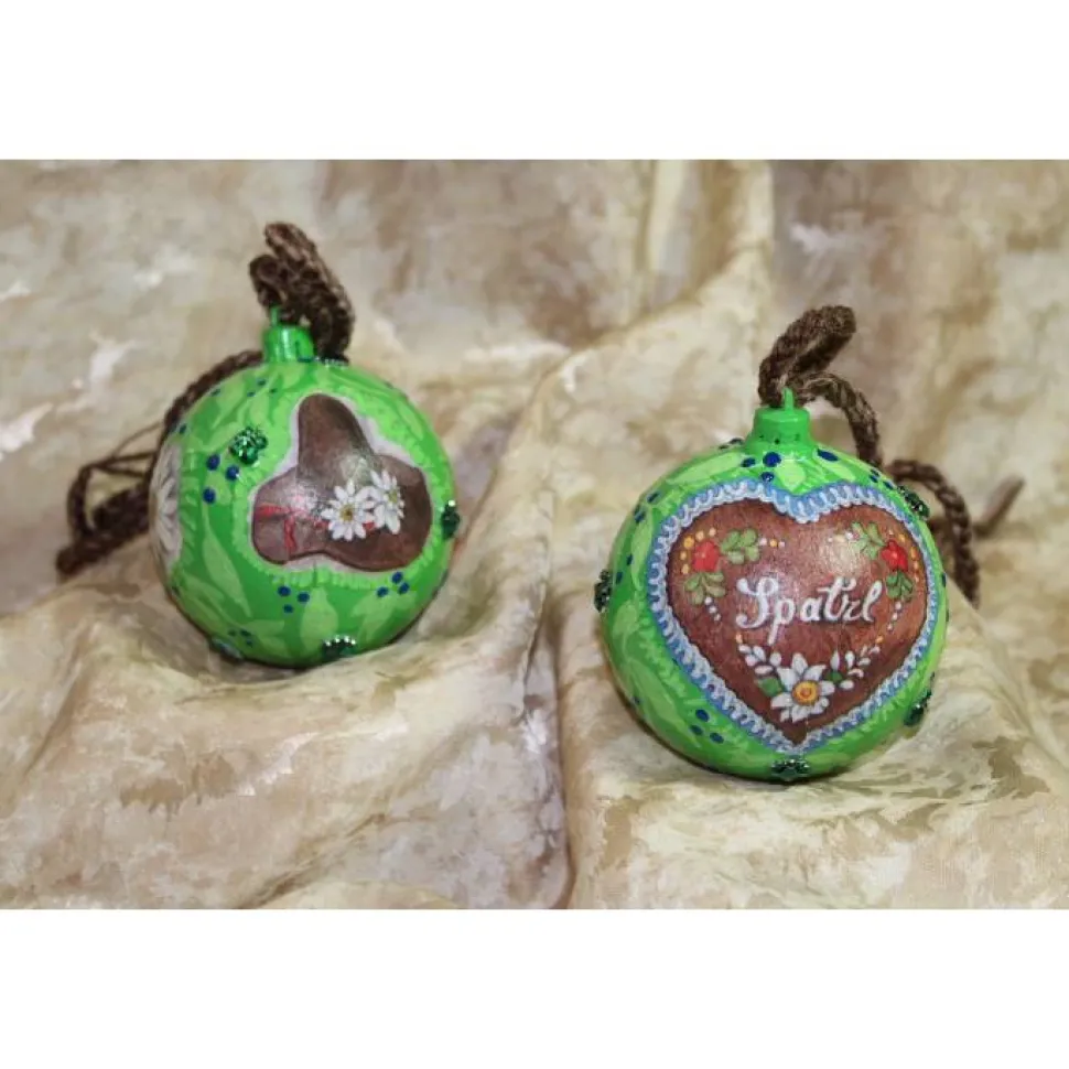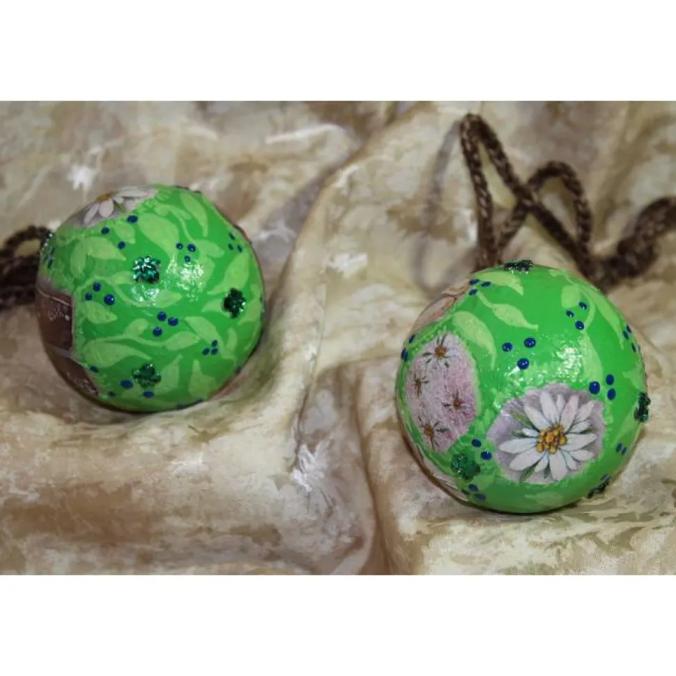 Zwei Dekokugeln gestaltet auf Kunststoffkugeln. Mit Serviettentechnik beklebt und Acrylfarben in Grüntönen und etwas blau bemalt. Verziert mit kleinen Glitzersteinen.