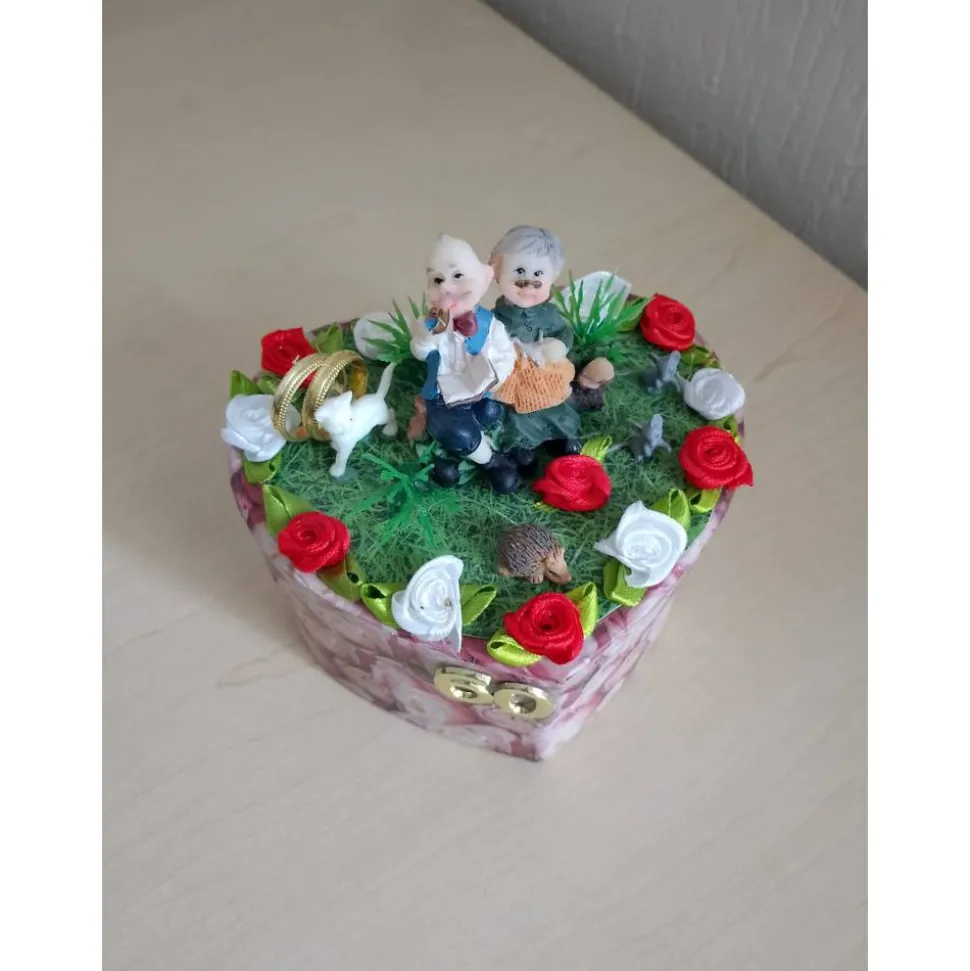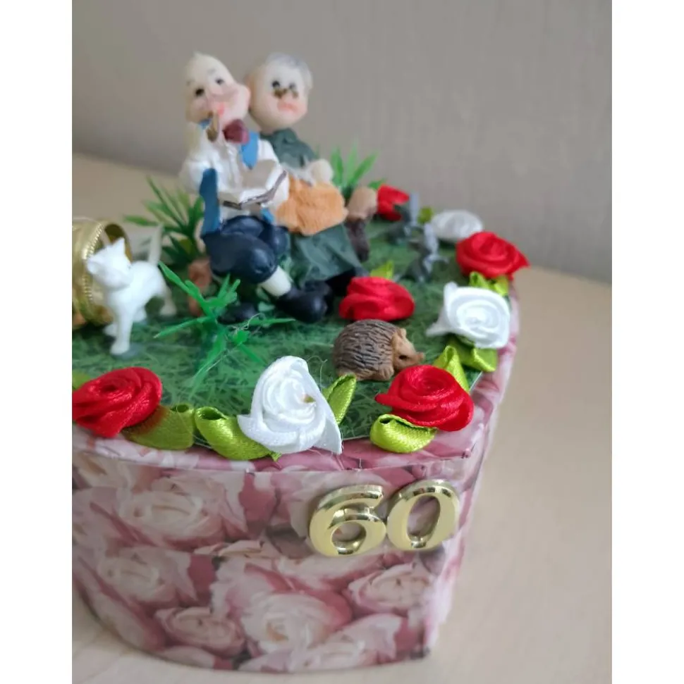 Statt das Geld einfach im Umschlag zu überreichen, findest du hier eine liebevoll dekorierte Geschenkbox, die speziell für die Diamantene Hochzeit gestaltet wurde. Die kleine Box misst 10 x 9 cm und erreicht inklusive der Figuren eine Höhe von 18 cm. Vorne ziert ein Band mit der Zahl 60 die Box, während auf dem Deckel ein festliches Paar von zarten Blüten umgeben ist – alles in passenden Farben abgestimmt.