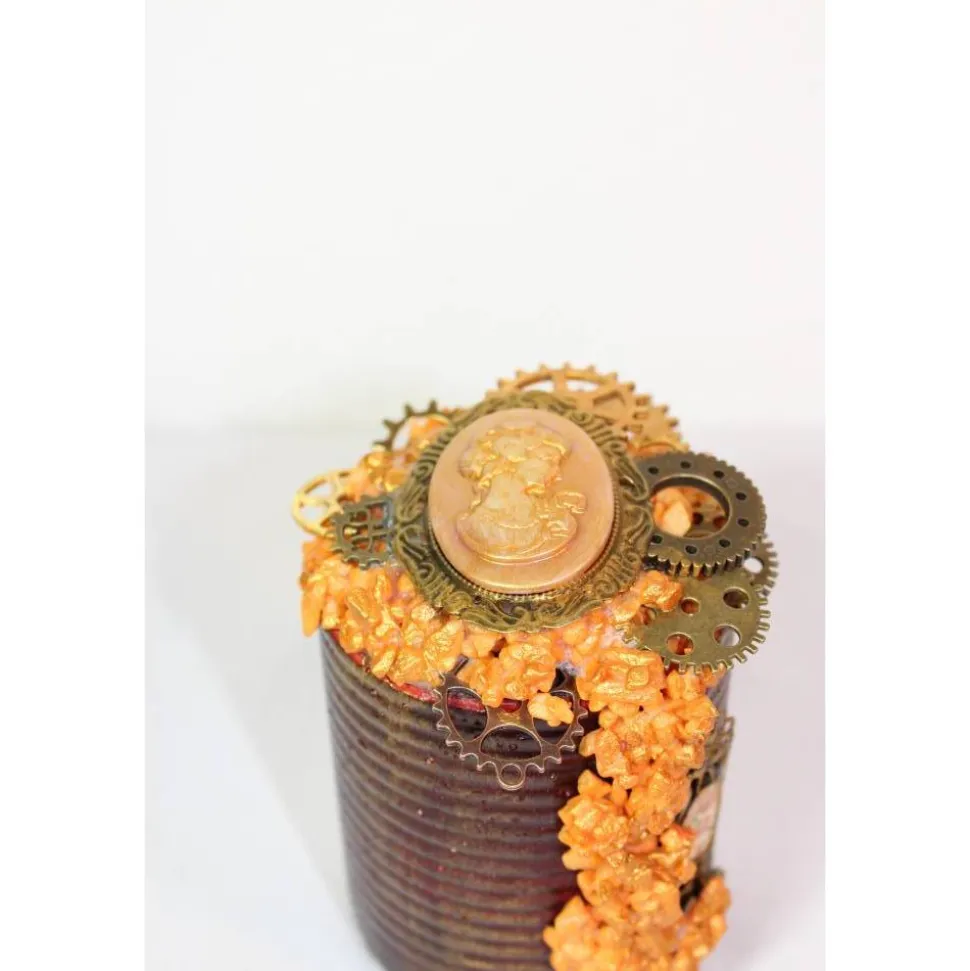 Ein aus Beton gegossenes Objekt in Form einer Konservendose. Künstlerisch gestaltet mit Acrylfarben in Rotbraun und Gold. Verziert mit einer Kamee, kleinen Zahnrädern, sowie Dekosteinchen in Orange.