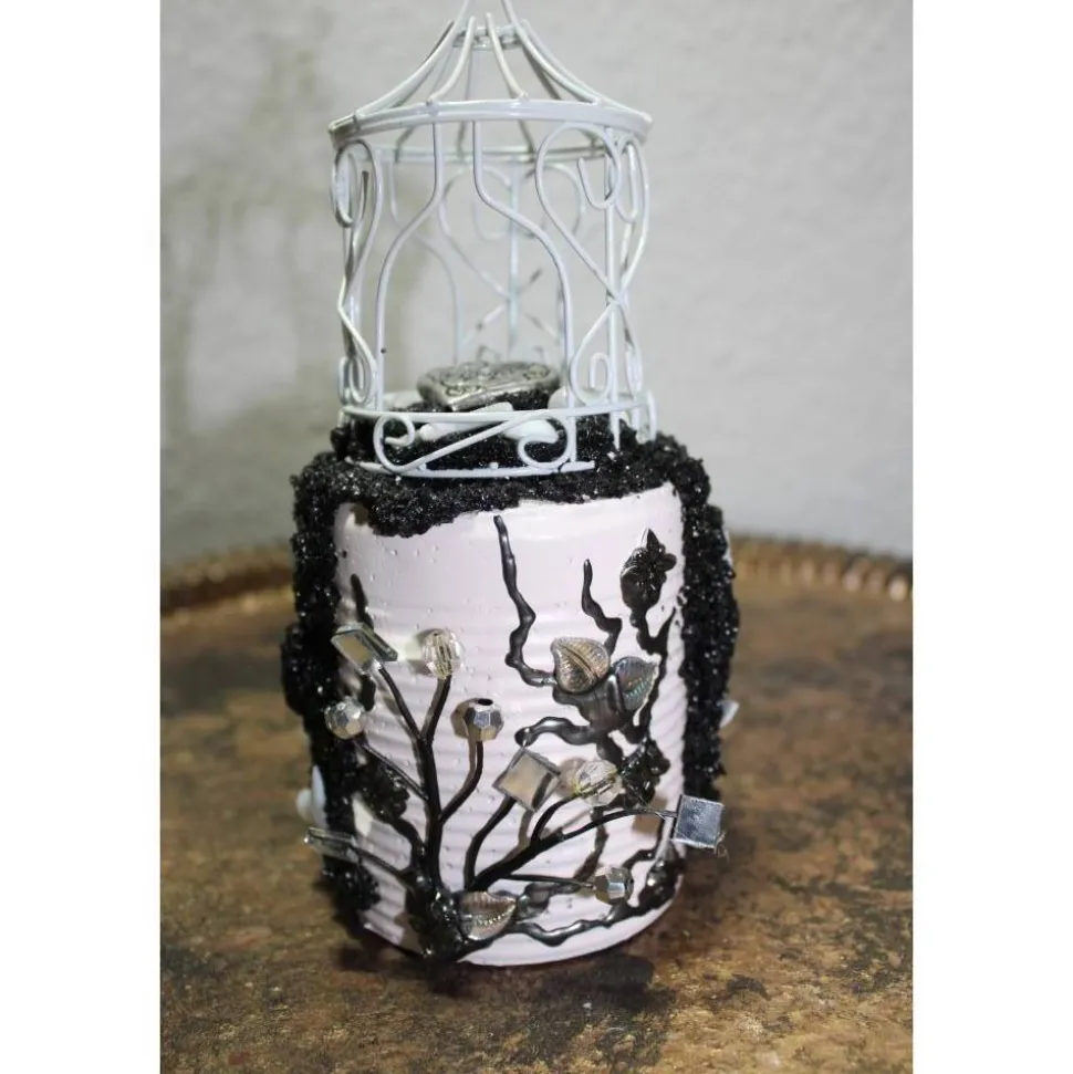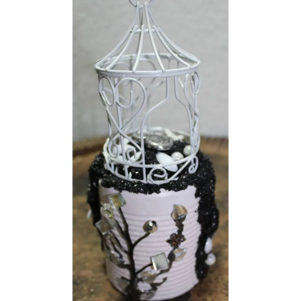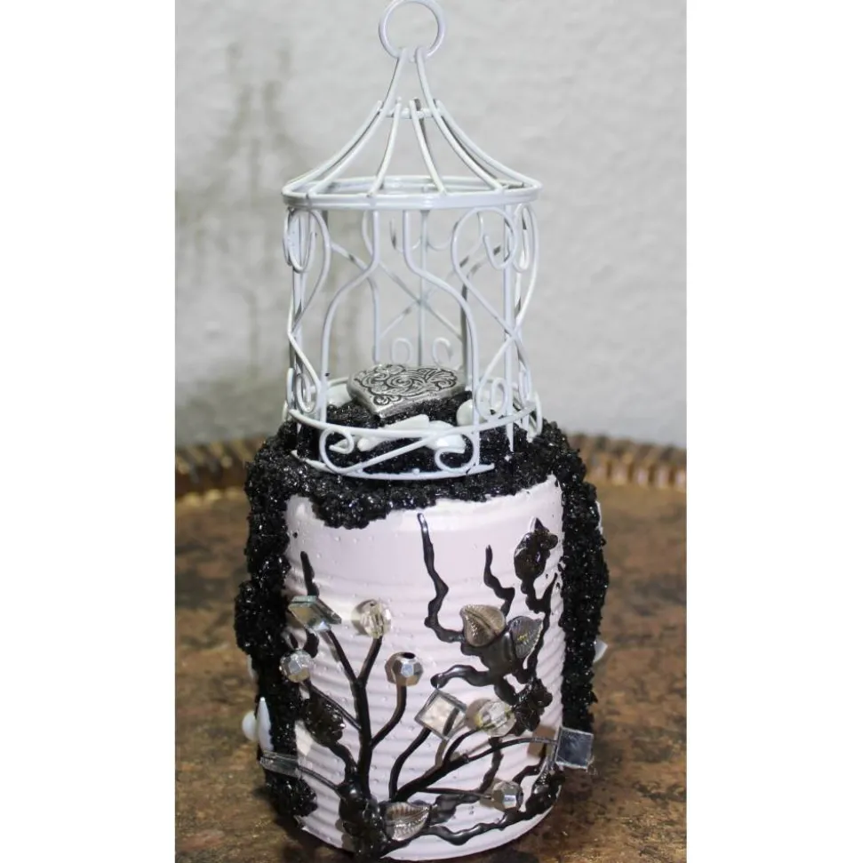 Ein aus Beton gegossenes Objekt in Form einer Konservendose. Künstlerisch gestaltet mit Acrylfarben in weiß und grau. Verziert mit Schmucksteinen und Kunststoffperlen, sowie schwarzem Granulat. Die kleinen Spiegelzweige und der angebrachte Minivogelkäfig runden die kleine Gestaltung ab. In der Mitte des Käfigs ist ein kleines, silbernes Herz platziert.