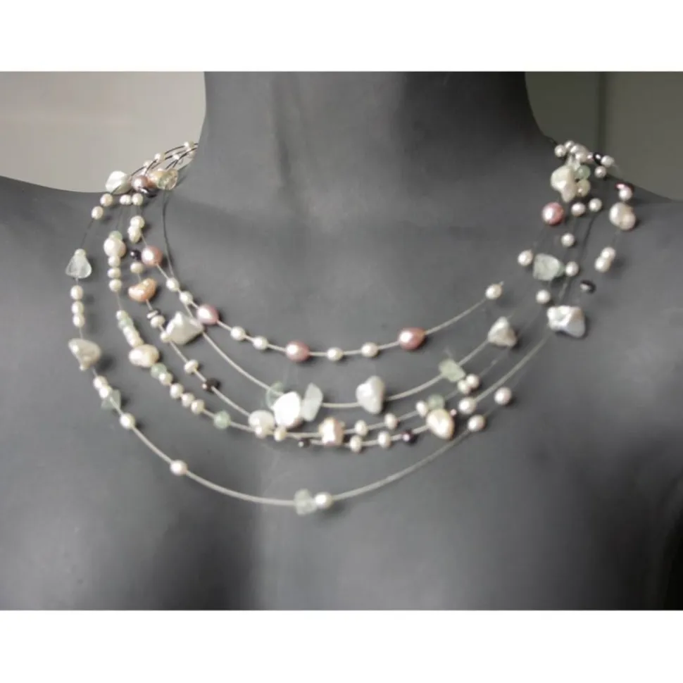 Die 5-reihige Perlenkette aus ummanteltem Juwelierdraht hat ein Schloß aus Sterling Silber mit Verlängerungskettchen.Die Länge der einzelnen Stränge ist zwischen 43 und 52 cm, das Verlängerungskettchen am Schloss ermöglicht indiviuelles Anpassen.