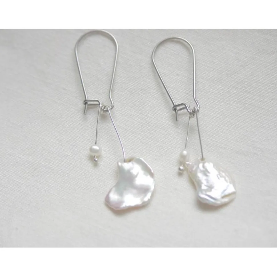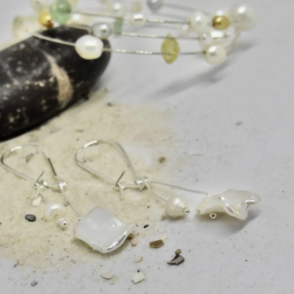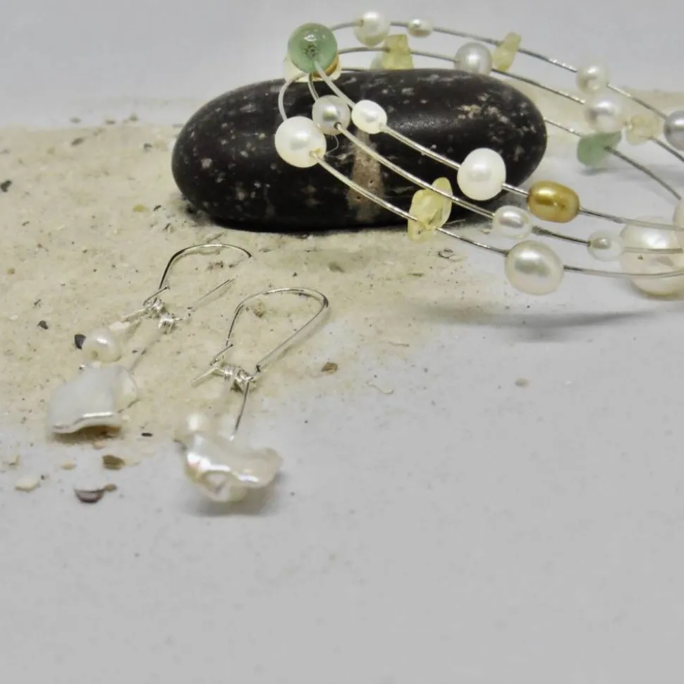 Dazu passend sind die Ohrhänger – Creolen aus Edelstahl, mit Silberdraht sind daran die Keshi-Perlen befestigt.