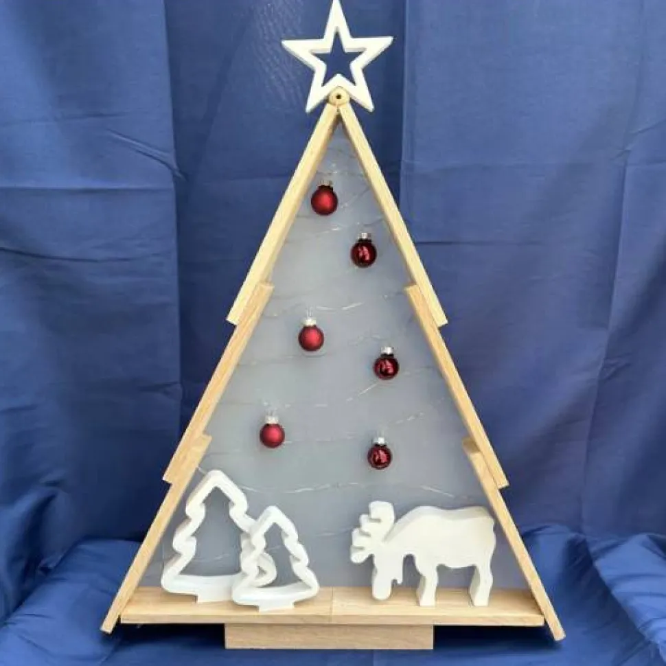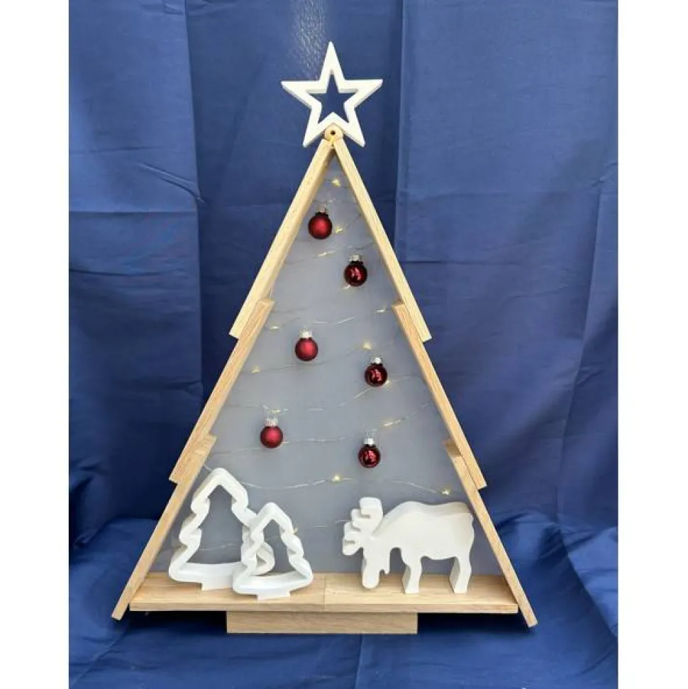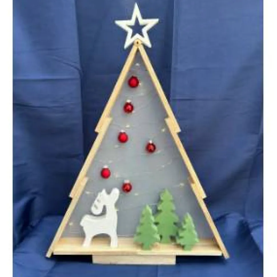 Unser dekorativer Holzbaum mit Lichterkette, roten Christbaumkugeln und liebevoll gestalteten Figuren ist ein stilvoller Akzent für die Adventszeit.