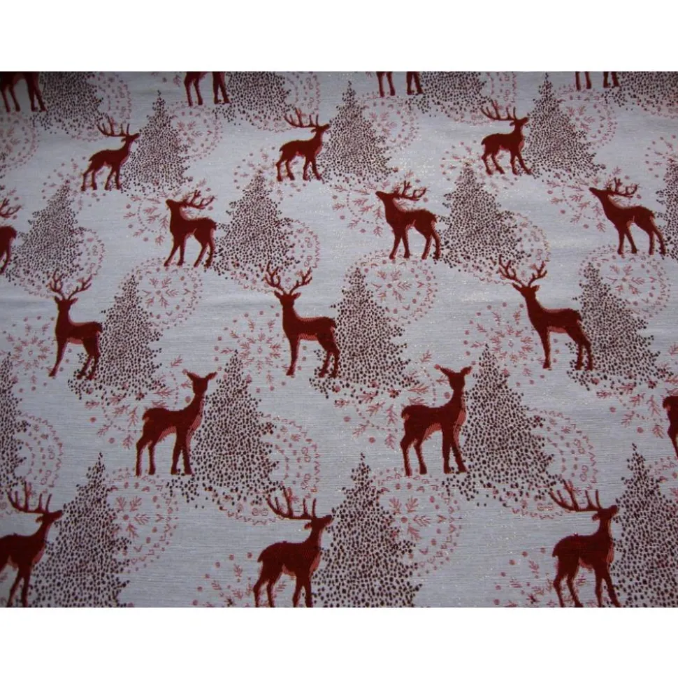 Verleihe deiner Weihnachtsdeko einen einzigartigen Look mit dem exklusiven Dekostoff-Weihnachten-Jacquard in natur mit rotem Reh und Hirsch im Wald.