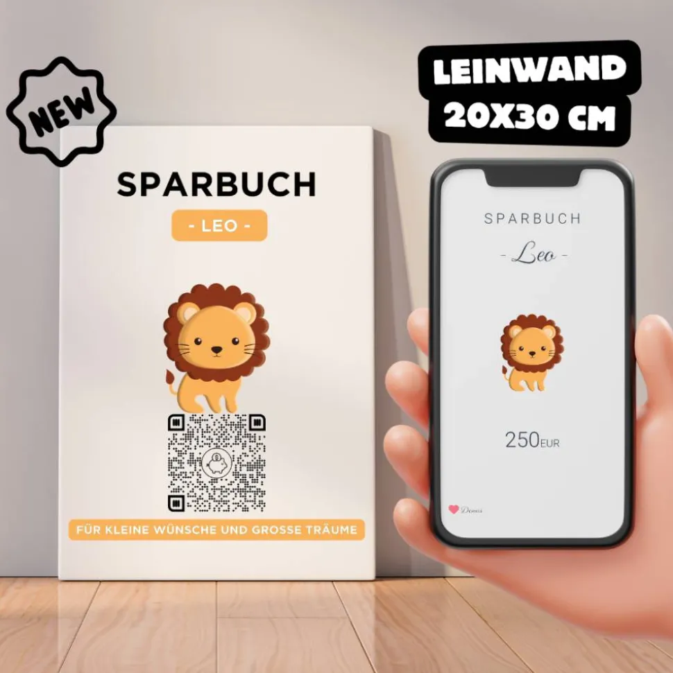 Digitales Sparbuch | Personalisiertes Geldgeschenk | QrCode Bild auf Leinwand 20x30cm | Motiv Löwe