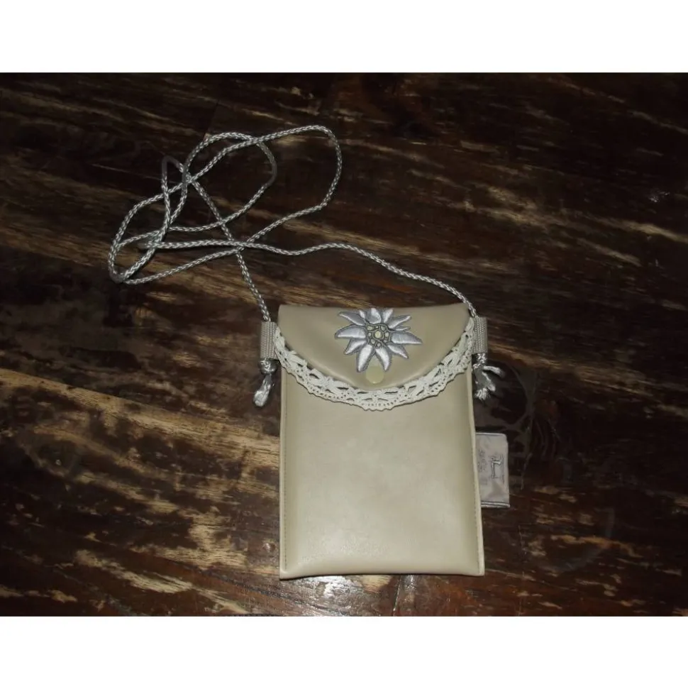 Aus neutralem beigen Kunstleder, stilgerechter Edelweißstickerei und kleiner Spitzenborte passt diese kleine Handtasche zu den meisten Dirndl und Trachtenkleidern.