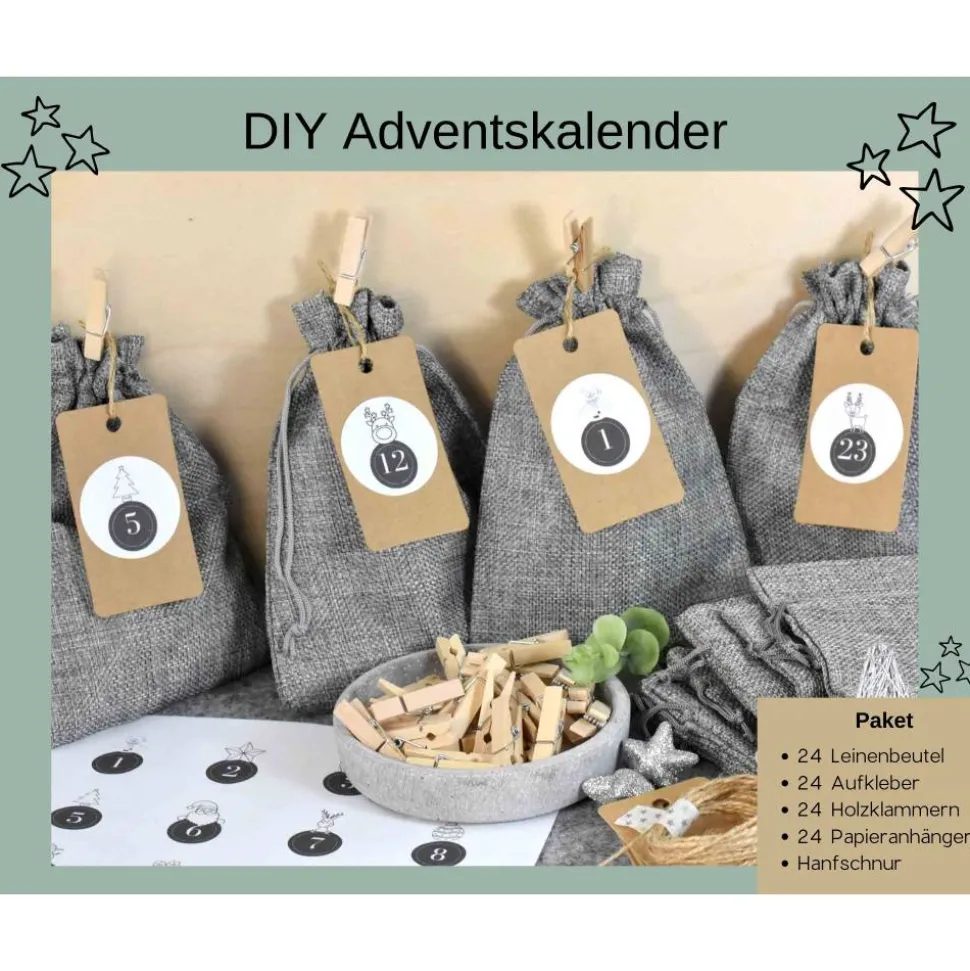 Hier gibts den wunderschönen DIY Adventskalender, den Hingucker in der Vorweihnachtszeit, zum selber basteln und befüllen! Das Set besteht aus 24 Leinen Säckchen, 1 Bogen mit 24 runden Aufkleber (40 mm), 24 Kraftpapier Anhänger, 24 Holzklammern und Hanfschnur. Motiv Schwarz / Weiß modern