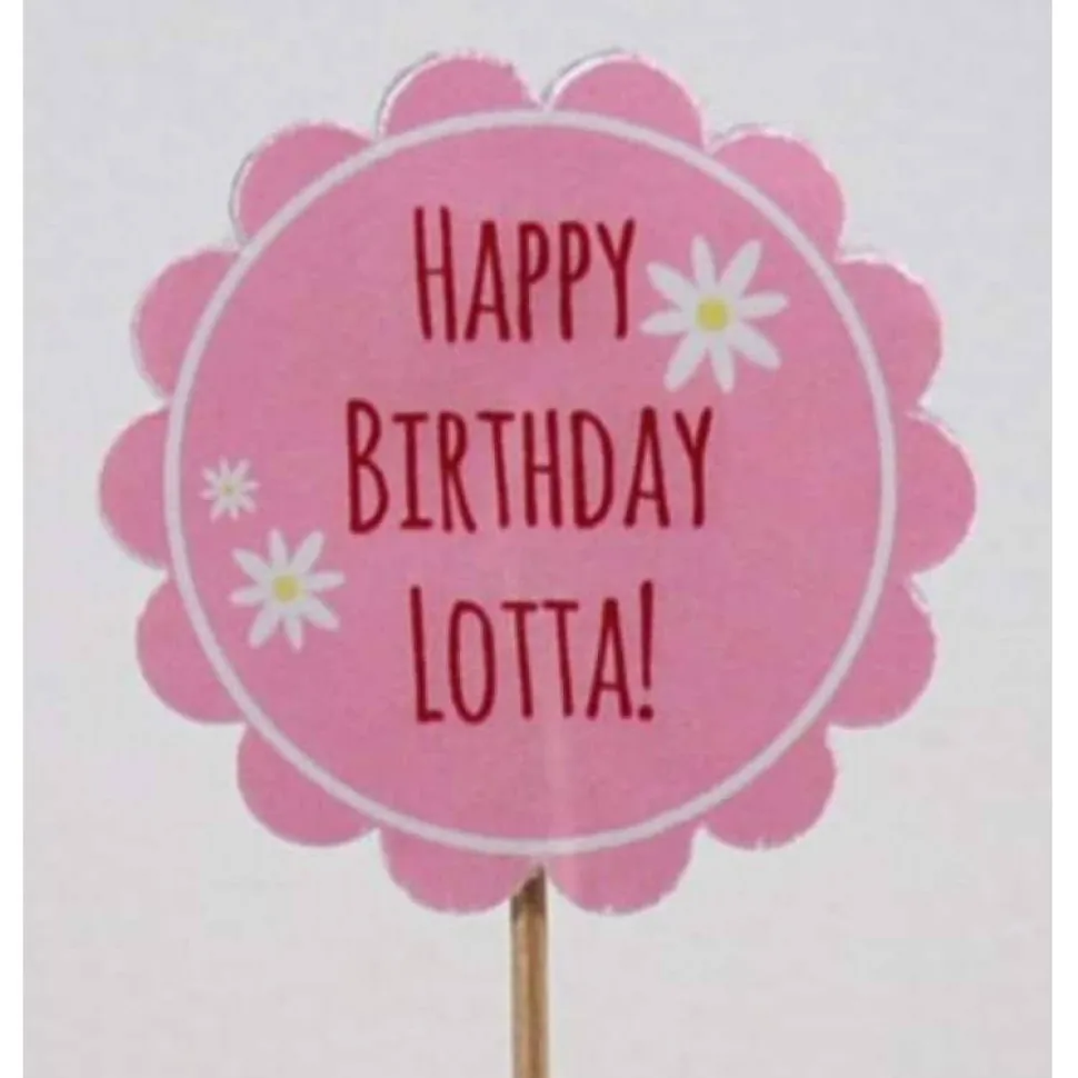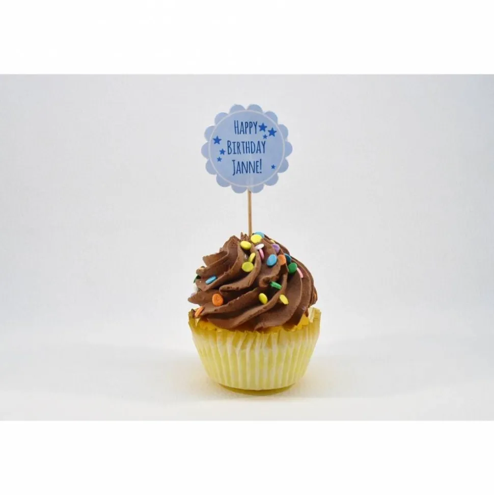 Das Cupcake-Topper-Set besteht aus 6 Flags mit der Aufschrift „Happy Birthday“ und dem individuellen Namen. Für Jungs die blaue Variante mit blauen Sternen und für die Mädels die rosa Form mit weißen Blümchen. Bitte bei Bestellung Namen angeben!