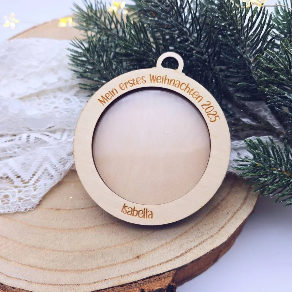 – Personalisierter Holzanhänger mit Gravur nach Wunsch (z. B. Mein erstes Weihnachten 2025, Frohe Weihnachten, Name)