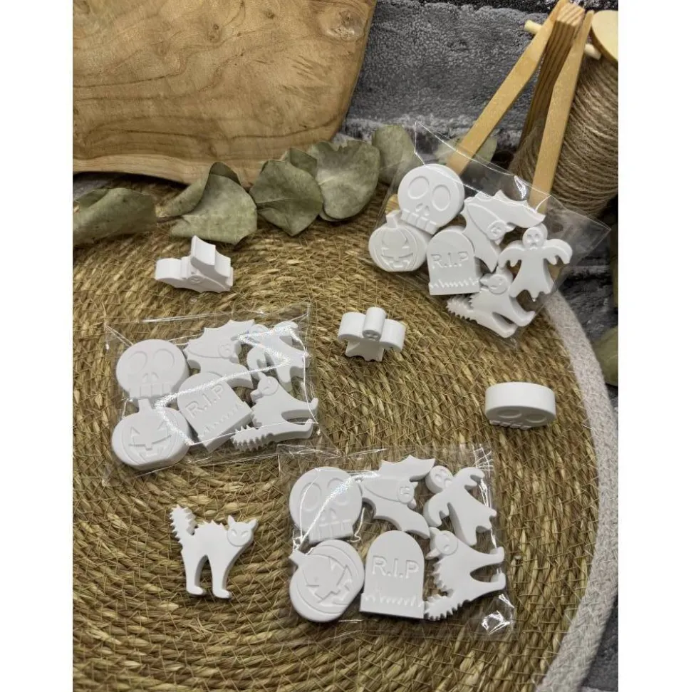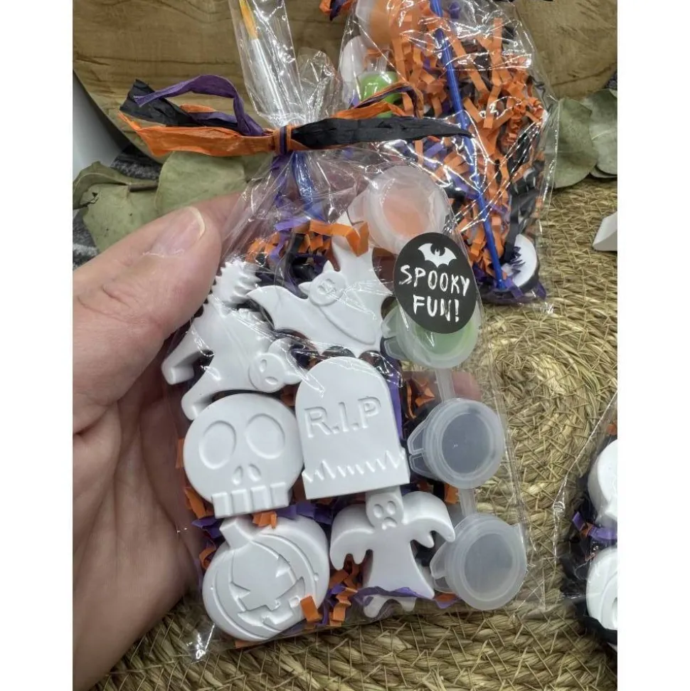 Ihr bekommt hier 6 Halloweenfiguren, 4 Farben und einen Pinsel oder nur 6 Figuren ohne alles.