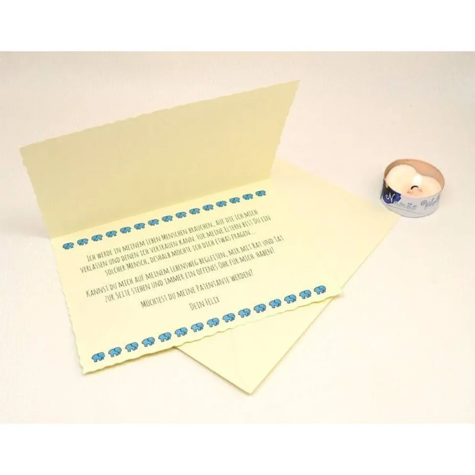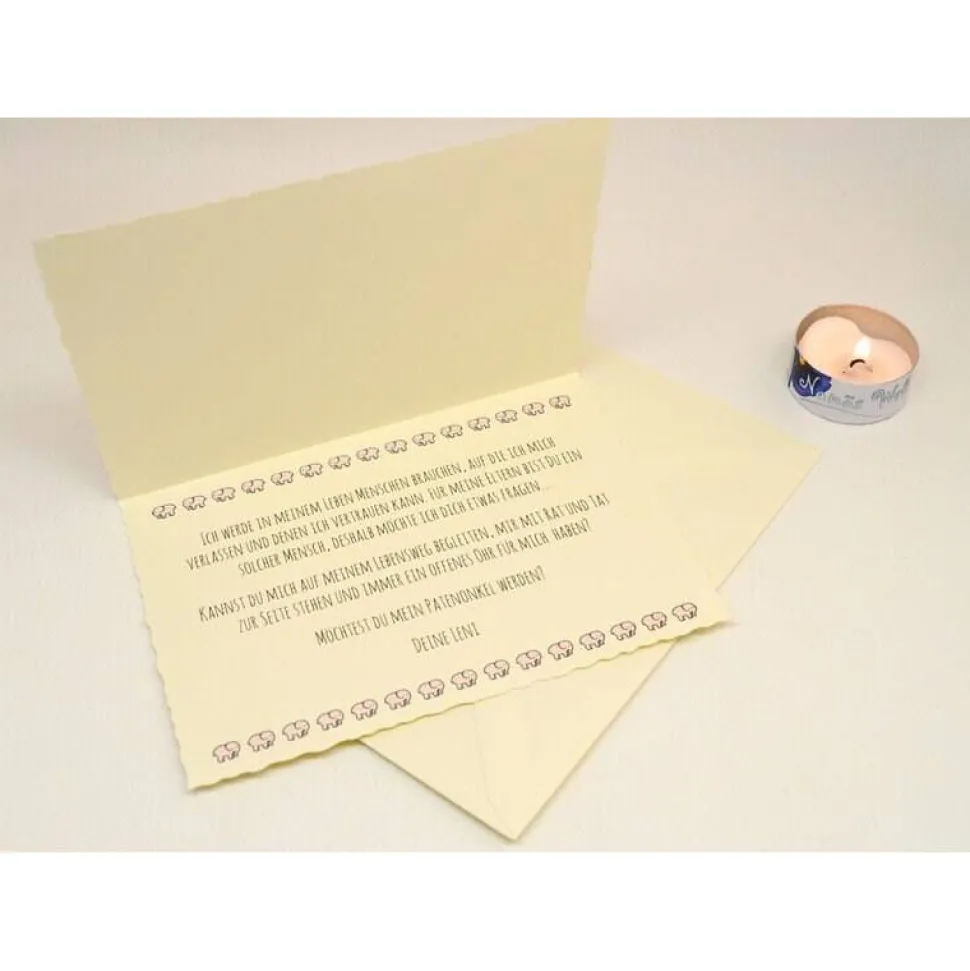 Die Elefanten als Symbol für Familie und Treue stehen hier für die Verbundenheit der Paten mit dem Kleinen. Zusätzlich ist der individuelle Name des Kindes aufgedruckt.