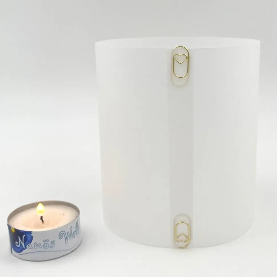 Für alle, die gerne öfter umdekorieren und einfach zu wenig Platz für die vielen schönen Dekoartikel haben, biete ich auch die „mobile“ Windlichtvariante an. Hierbei einfach bei Eurer Bestellung Bescheid geben, dann lasse ich den Klebestreifen weg und Ihr erhaltet stattdessen die hübschen goldfarbenen Herzbüroklammern. Mit diesen könnt Ihr das Windlicht zusammenklammern, wenn es zum Einsatz kommen soll. Danach lässt es sich sehr platzsparend (am besten in dem Umschlag, in dem Ihr es von mir erhaltet) aufbewahren.