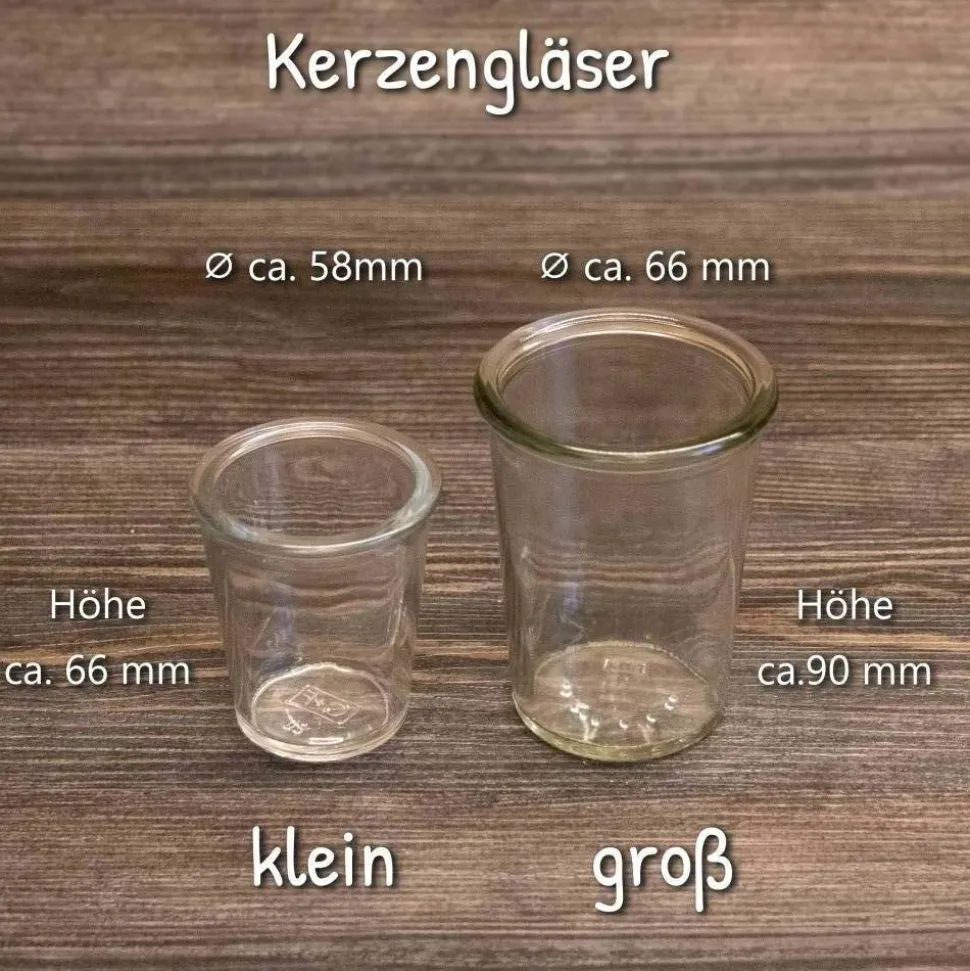 Das große Kerzenglas besteht aus Klarglas, hat eine Höhe von ca. 90 mm und einen Durchmesser an der Mündung von ca. 68 mm. Es ist geignet für ca 100 Gramm Wachs.