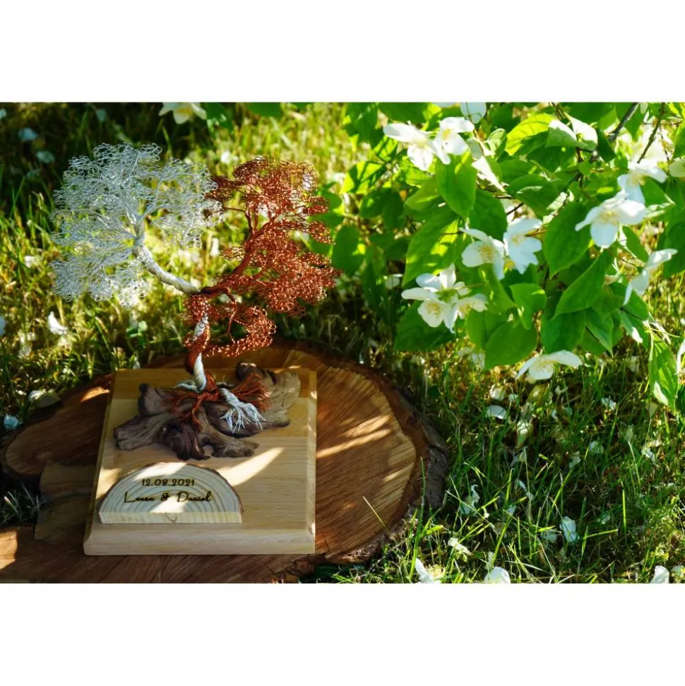 Die miteinander verschlungenen Bäume aus Kupfer- bzw. Silberdraht symbolisieren auf natürliche Weise die Bindung zweier Menschen.