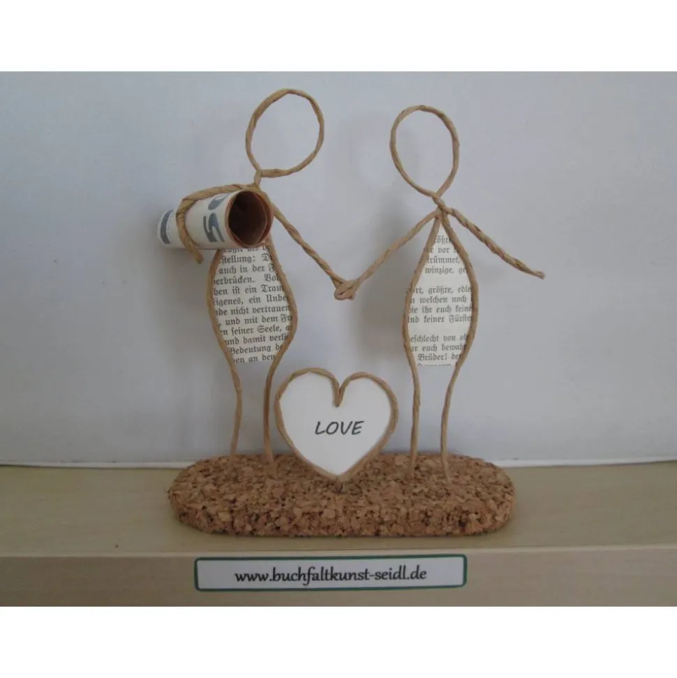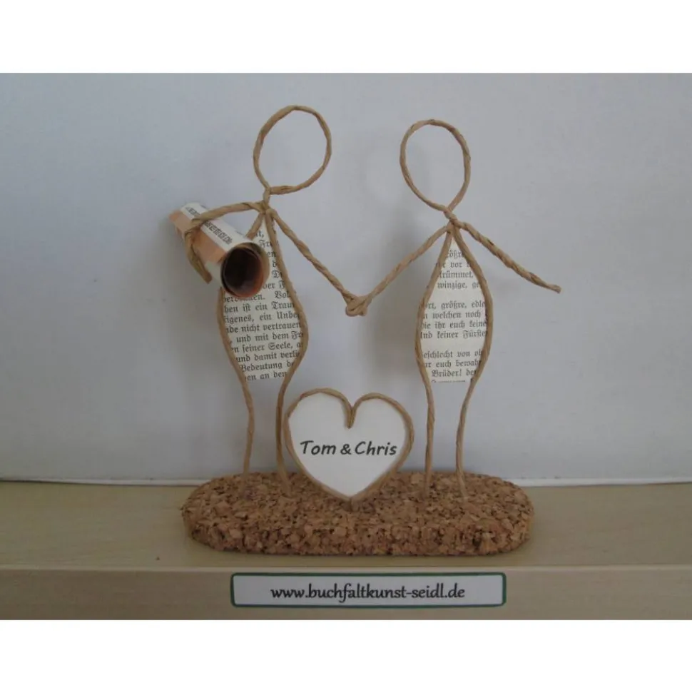 Meine zahlreichen, verschiedenen Drahtfiguren sind ein süßes, kleines Geschenk, z.B. für Hochzeit, Valentinstag, Geburtstag, Jahrestag, Weihnachten etc. oder eine hübsche Dekoration im eigenen Zuhause. Jede Figur fertige ich in liebevoller Handarbeit aus Papierdraht, Buchseiten mit altdeutscher Schrift und Korkplatten speziell für Sie an. Einige Figuren sind individualisierbar und personalisierbar, indem ich z.B. in die Schilder oder Herzen Ihre Wunsch-Namen oder -Wörter einfüge.