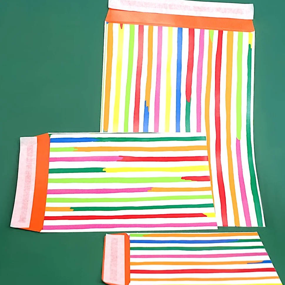 Fröhlich bunt gestreifte Papiertüten (80 g) für kleine Geschenke. Praktischerweise haben sie einen Klebeverschluss, der durch einen Abdeckstreifen geschützt ist. Die große Tüte ist auch wunderbar für Taschenbücher geeignet.