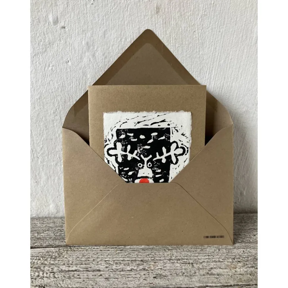 So machte ich mich ans Werk und es entstand (diesmal ohne Blutvergießen*) dieser lustige Elch, den ich auf Büttenpapier druckte und dann auf Kraftkarton klebte.