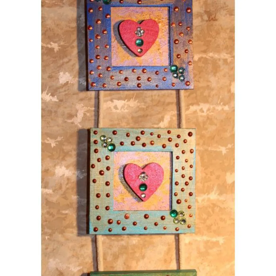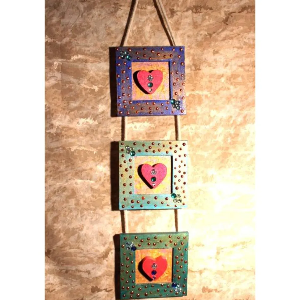 Die kleine Gestaltung besteht aus einem dreiteiligen Holzrahmen, befestigt an einer hellen Kordel.