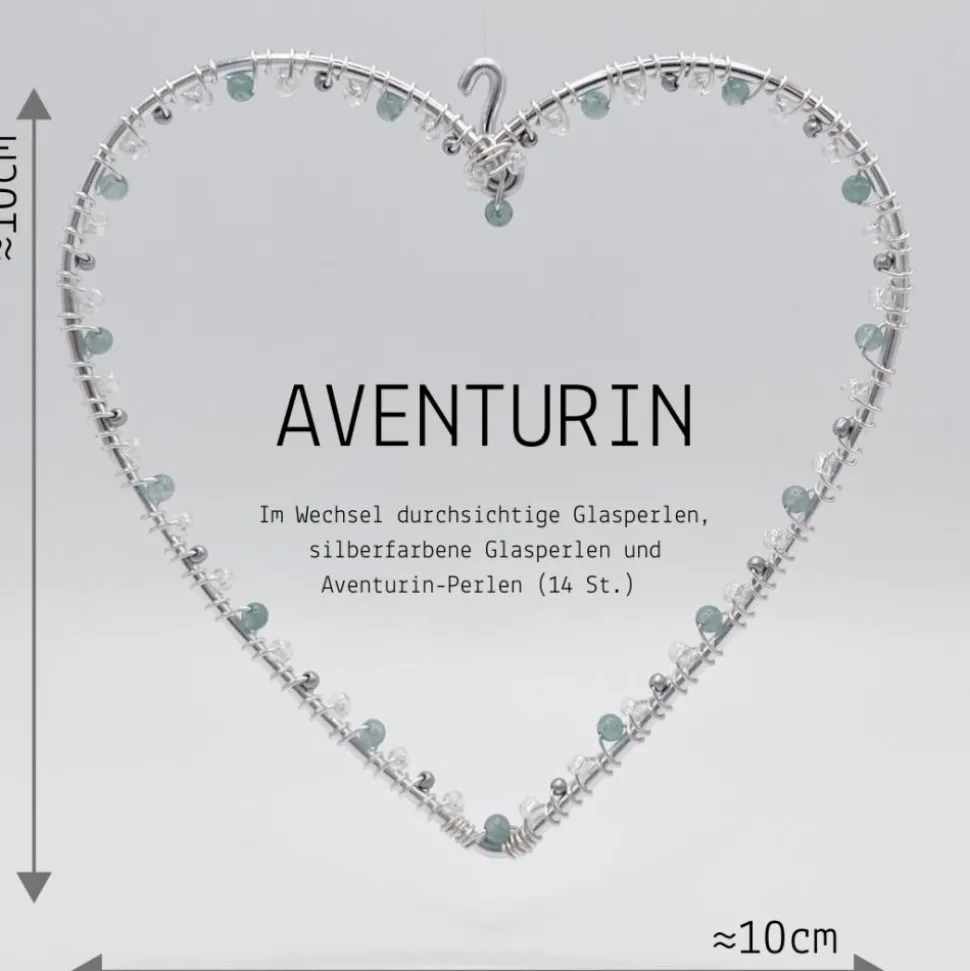 Dieser Fensterschmuck wird liebevoll als Handarbeit gefertigt. Jedes Herz wird sorgfältig aus rostfreien Aluminiumdraht geformt und mit glänzenden Glasperlen und Energie spendenden Heilsteinen dekoriert. Jeder Fensterschmuck ist ein Unikat mit 14 Heilsteinen und einer Größe von ungefähr 10 x 10 cm.
