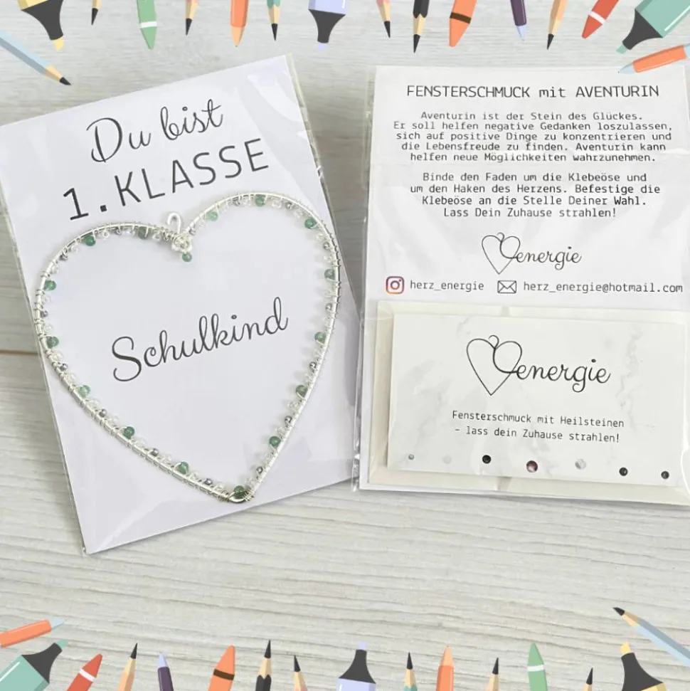 Der Schulbeginn kann spannend sein sowohl für das neue Schulkind als auch für die Eltern. Diese Karte mit Fensterschmuck ist nicht nur ein schönes Geschenk für die Schultüte, sondern hat auch eine tiefere Bedeutung. Das Herz ist nämlich mit hellgrünen Aventurin-Perlen dekoriert.