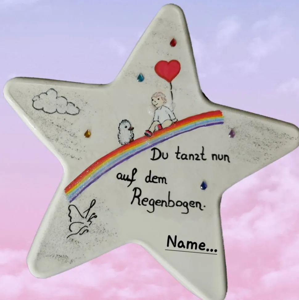 Tauche ein in die zauberhafte Welt von „Du tanzt jetzt auf dem Regenbogen“, wo ein kleines Meisterwerk aus Liebe und Erinnerung entsteht! Unsere handgefertigten Sterne sind weit mehr als nur Dekoration – sie sind ein Ausdruck von Herz und Kunst, die Liebe und Emotionen in jedem Detail widerspiegeln.