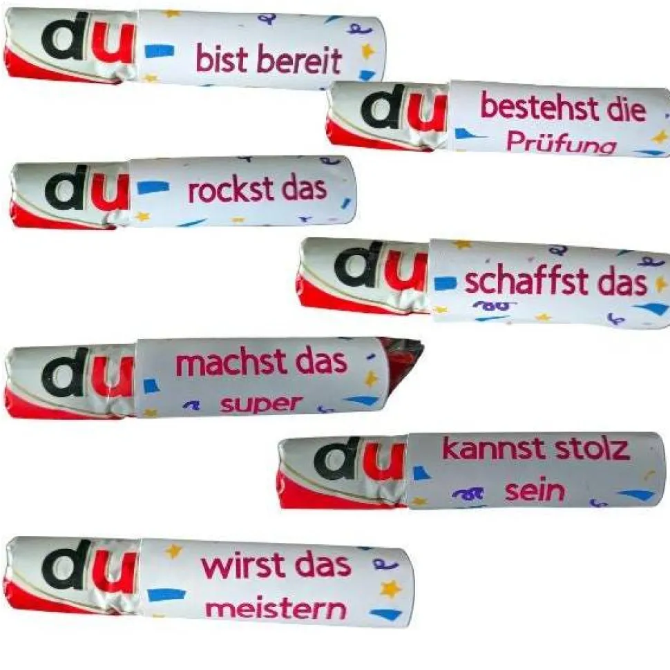 Unsere individuell gestalteten Duplo Aufkleber mit motivierenden Sprüchen sind die perfekte Nervennahrung für jede Prüfungssituation. Diese hochwertigen Sticker sind speziell dafür designt, um Duplo-Riegel optisch aufzuwerten und gleichzeitig als kleine Aufmunterung während der stressigen Prüfungszeiten zu dienen. Jeder Aufkleber trägt einen inspirierenden Spruch, der hilft, den Kopf frei zu bekommen und positive Energie zu vermitteln. Ideal als kleine Aufmerksamkeit für sich selbst oder als Geschenk für Freunde und Kommilitonen. Die Aufkleber sind einfach anzubringen. Nur einmal benutzbar. Perfekt für Studenten, Schüler und Berufstätige, die eine kleine Motivationshilfe benötigen.