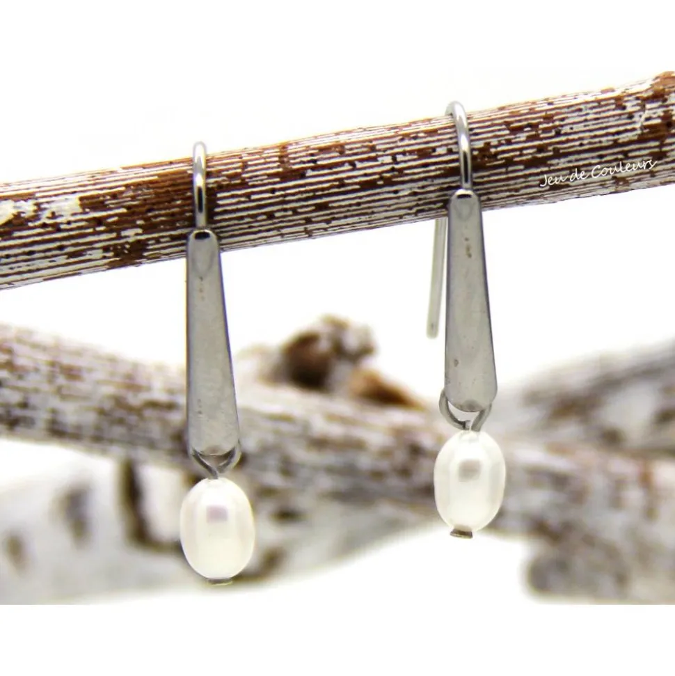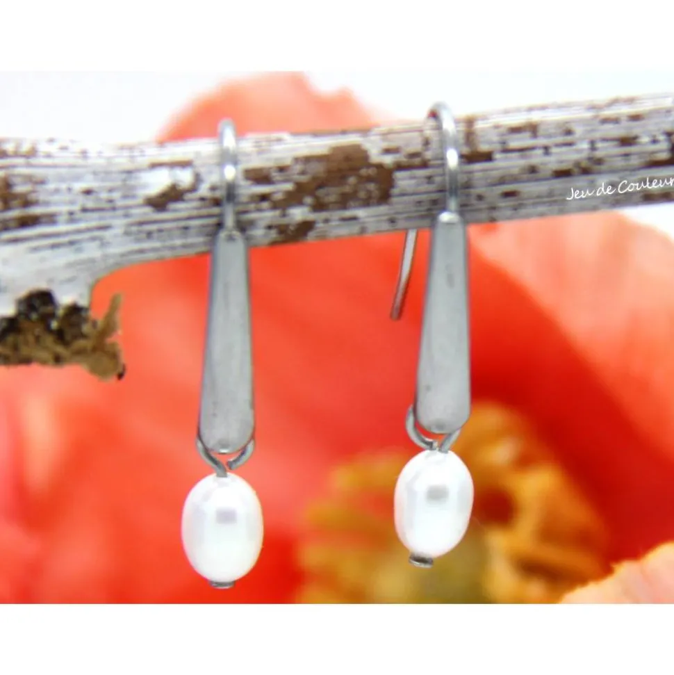 Die Basis dieses zeitlosen Ensembles ist ein Paar Edelstahl-Fischerhaken. An diese sind echte, weiße Süßwasser-Zucht-Perlen in Reisform eingehängt. Selbstverständlich sind die Ohrhaken mit transparenten Stoppern bestückt.