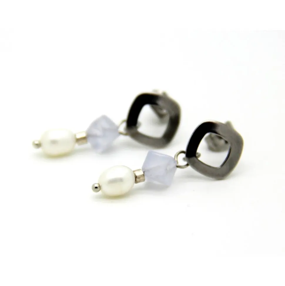 Die Basis dieses harmonischen Duos ist ein Paar Ohrstecker aus poliertem Edelstahl in Form eines Karos. An diese sind eine Komposition aus einer weißen Zuchtperle, einem zartblauen, diagonal gebohrten Chalcedon-Würfel sowie einer kleinen Edelstahl-Röhre eingehängt.