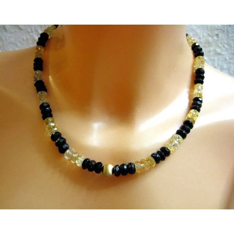 Die facettierten Citrin und Granat Rondellen in 1A Qualität sorgen für ein atemberaubendes Funkeln an deinem Hals. Die Kette hat eine Länge von 44 cm und wird mit einem hochwertigen Karabinerverschluss aus vergoldetem 925er Sterling Silber geschlossen.
