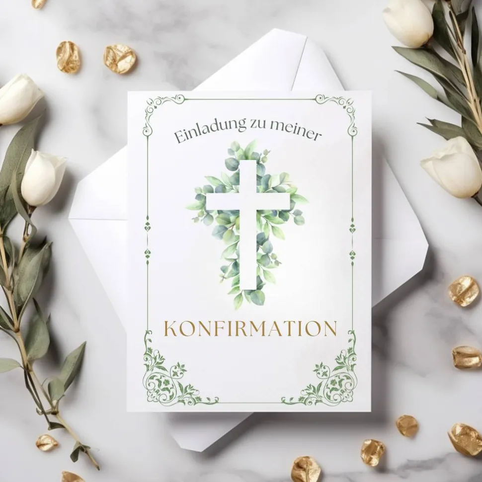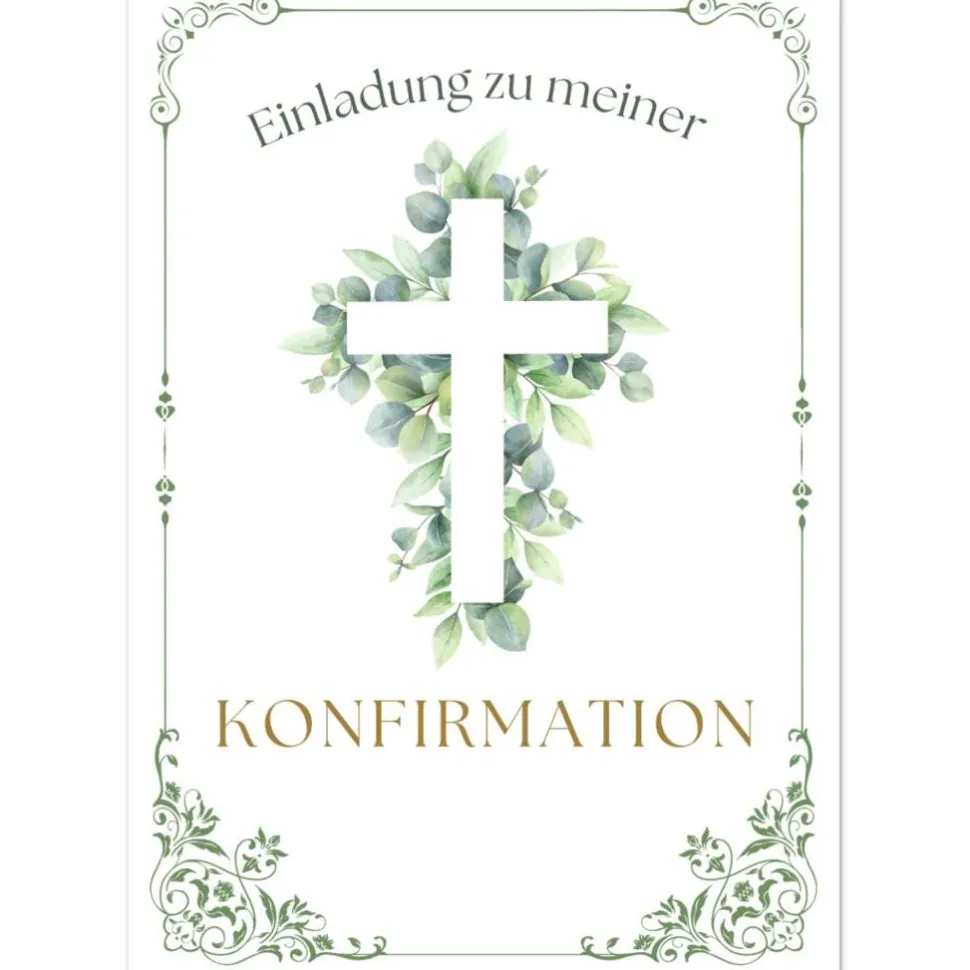 Jede edle Konfirmationskarte ist mit einem elegant-christlichen Motiv gestaltet: Ein zentrales Kreuz, umgeben von zarten Blättern, verleiht der Karte eine symbolstarke und zugleich natürliche Ausstrahlung. Die florale Bordüre, die die Karte dezent einrahmt, sorgt für eine elegante, feierliche Stimmung. Auf der Vorderseite befindet sich der Schriftzug „Einladung zu meiner Konfirmation“ in harmonisch abgestimmter Schriftart – klar, würdevoll und einladend. Auch die Rückseite greift das Kreuz- und Blätterdesign erneut auf, wodurch das Gesamtbild stimmig abgerundet wird. Das Motiv symbolisiert nicht nur den feierlichen Anlass, sondern auch die persönliche Bedeutung dieses besonderen Glaubensschrittes.