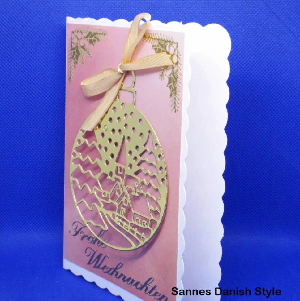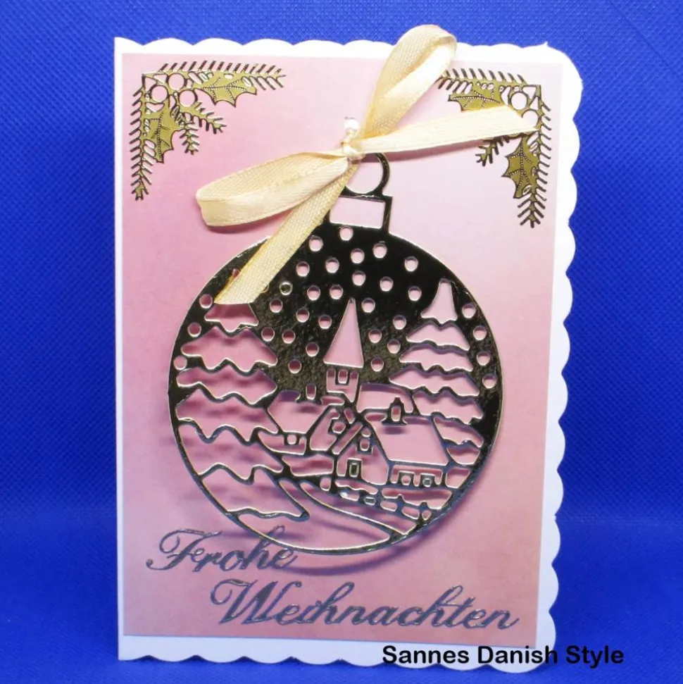 Verschenke festliche Freude mit einer edlen Weihnachtskarte im DIN A6 Format und genieße das charmante Weihnachtsdorfkugel-Motiv. Die Karte besteht aus einer hochwertigen Blankokarte mit Wellenrand und 300 g/m² Papierstärke.