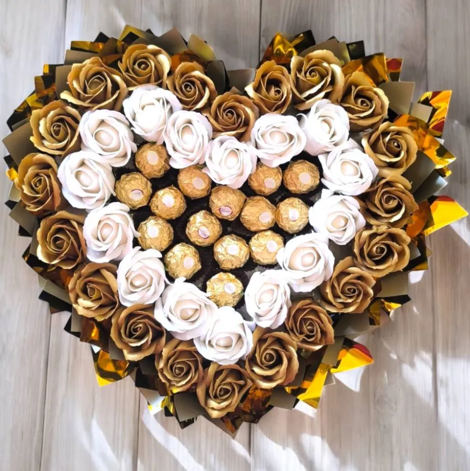 Dieser exklusive essbare Ferrero-Rocher-Strauß in Herzform steht für Luxus, Eleganz und besondere Wertschätzung. Im Mittelpunkt des Arrangements befinden sich original Ferrero-Rocher-Pralinen, die in liebevoller Handarbeit zu einem harmonischen Herz geformt wurden. Umrahmt wird das Pralinenherz von hochwertigen Dekorrosen in Weiß und Gold, die dem Strauß eine edle und zeitlose Ausstrahlung verleihen.
