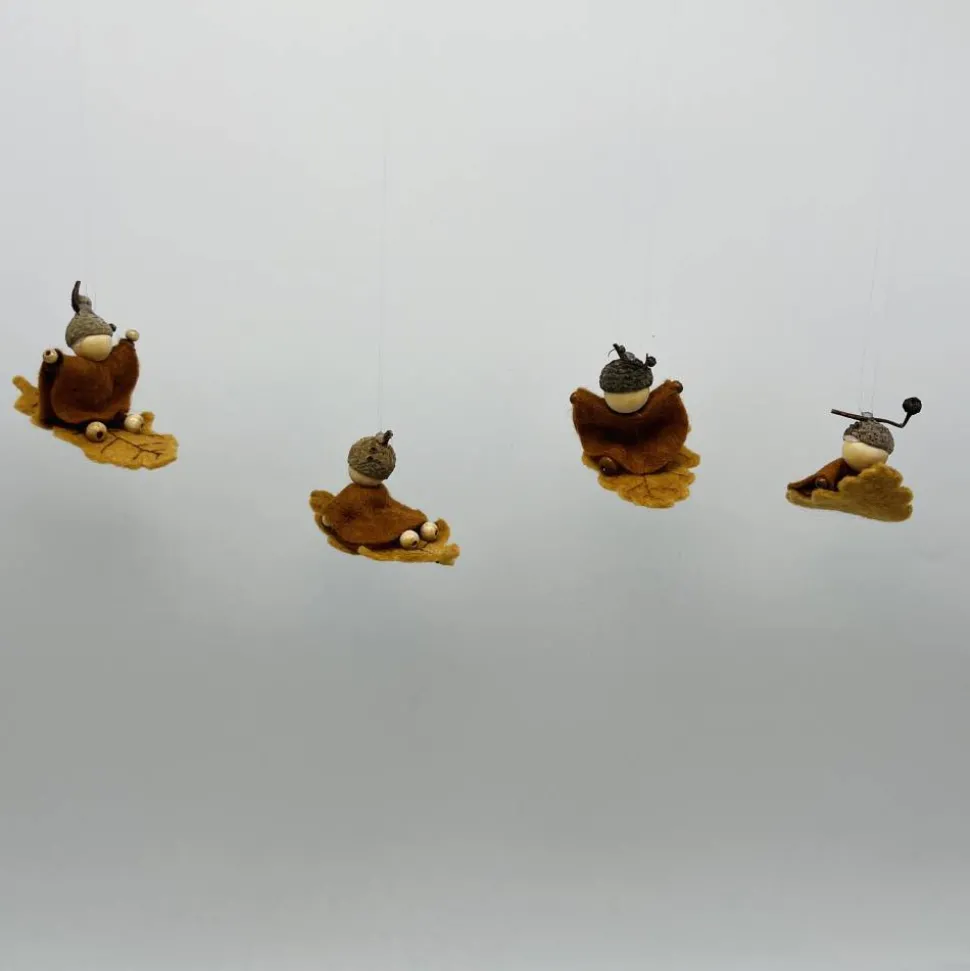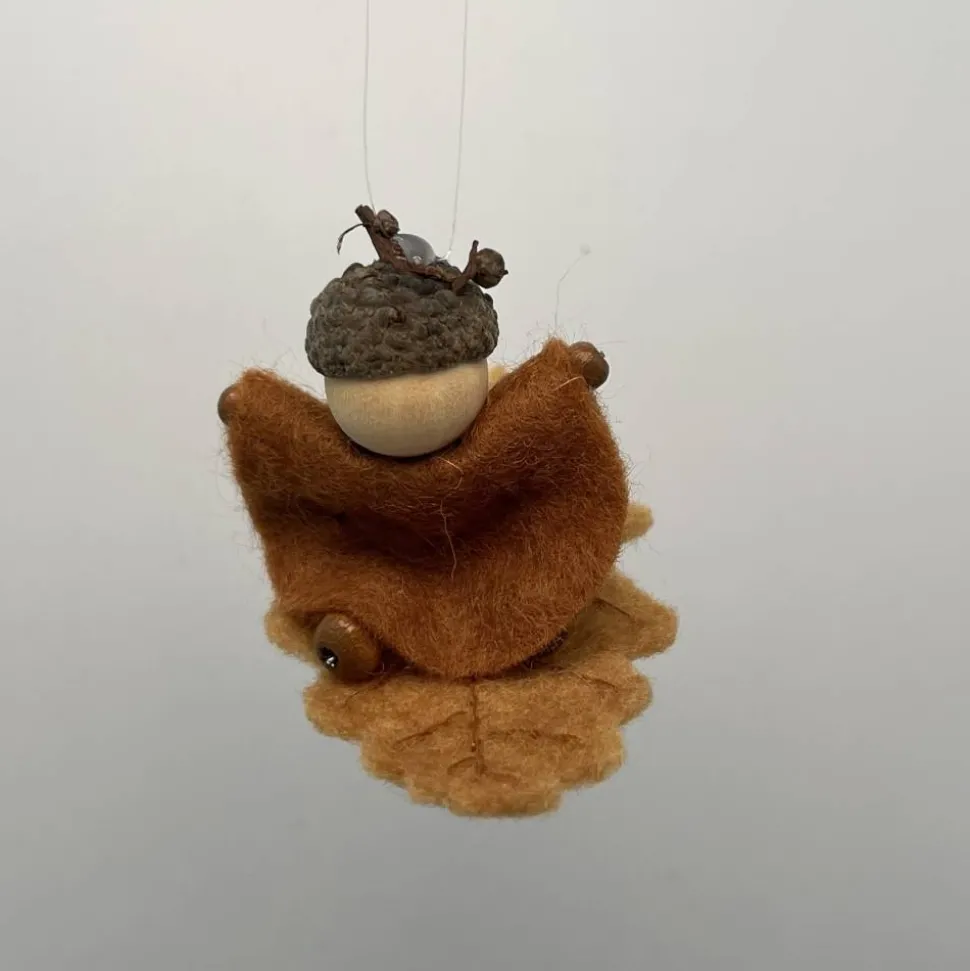 Kopf, Hände und Füße aus bunten Holzperlen, Kleid und Hut sind aus buntem Filz genäht. Das Eichenblatt ist aus Wollfilz welcher von mir noch bestickt wurde. Das Männchen sitzt oder liegt auf einem Eichenblatt.. Am Eichelhut ist ein durchsichtiger Nylonfaden befestigt, an welchen das Eichenmännchen aufgehängt werden kann.