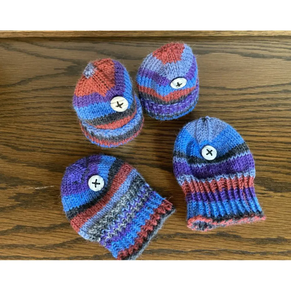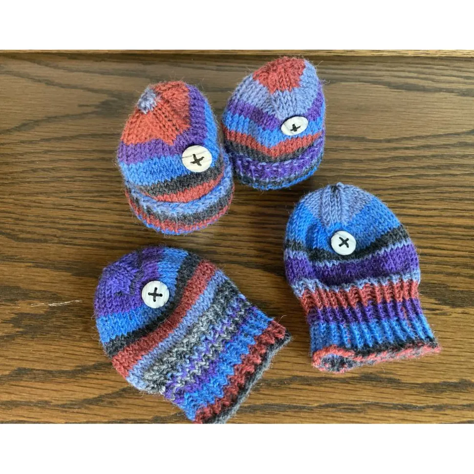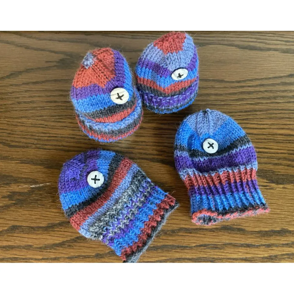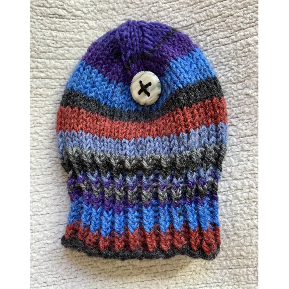 Die hier zum Kauf angebotenen Eierwärmer-Mützen sind aus Sockenwolle gestrickt in der durch den Fadenlauf vorgegebenen Farbkombination von rot-blau-schwarz. Das breite Bündchen ermöglicht einen Umschlag zum besseren Halt auf dem Ei. Im oberen Teil ist zusätzlich ein Knopf als Verzierung aufgenäht.