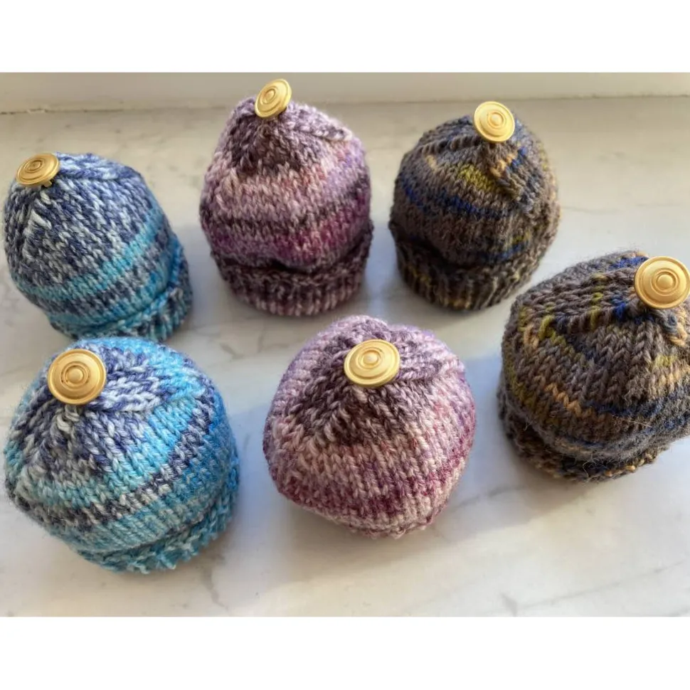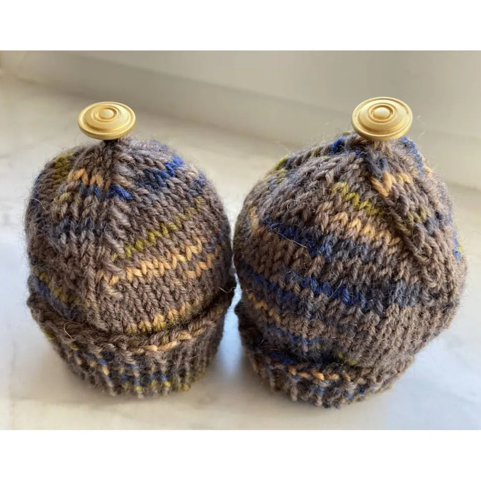 Die hier zum Kauf angebotenen Eierwärmer-Mützen sind aus Sockenwolle gestrickt in den durch den Fadenlauf vorgegebenen Farbkombination von blau-meliert, rosa-meliert und braun mit gelb. Das breite Bündchen ermöglicht einen Umschlag zum besseren Halt auf dem Ei. An der Spitze ist zusätzlich ein goldfarbener Knopf als Verzierung aufgenäht.