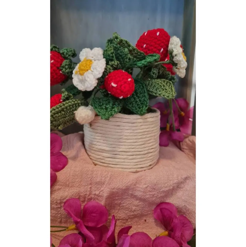 Dieses liebevoll gefertigtes Arrangement besteht aus gehäkelten Erdbeeren, Blüten und Blätter – jedes Detail sorgfältig in Handarbeit gearbeitet.
