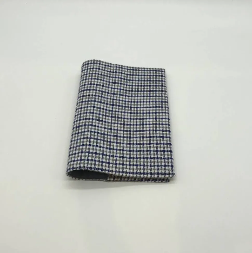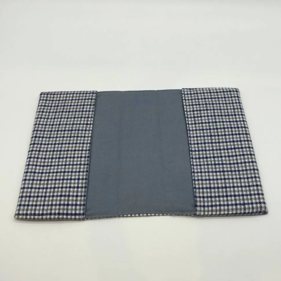 Hier ist der Einband in einem Karostoff in blau, grau und weiß, der Innenstoff ist in passendem grau.