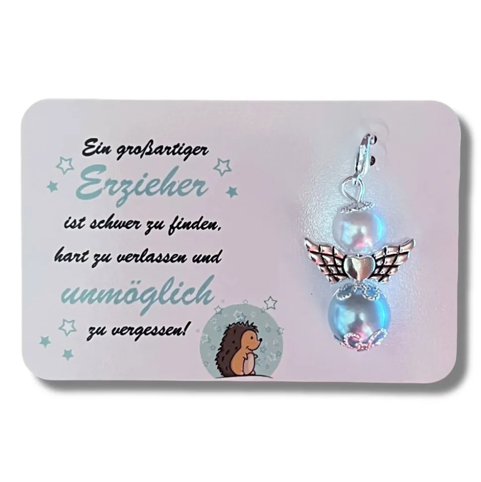 Ein Perlenengel hat mit Karabinerhaken eine Gesamtlänge von ca. 4,5 cm, Flügelfarbe silber.