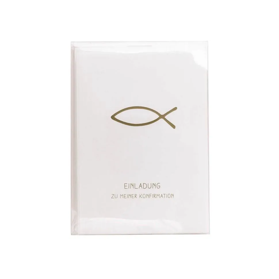 20-teiliges Set mit 10 Klappkarten Einladung und 10 passenden Kuverts in weiß. Die Karten sind bedruckt mit einem christlichen Fisch und dem Text Einladung zu meiner Konfirmation. Die Karten und Umschläge können zusätzlich gestaltet werden.