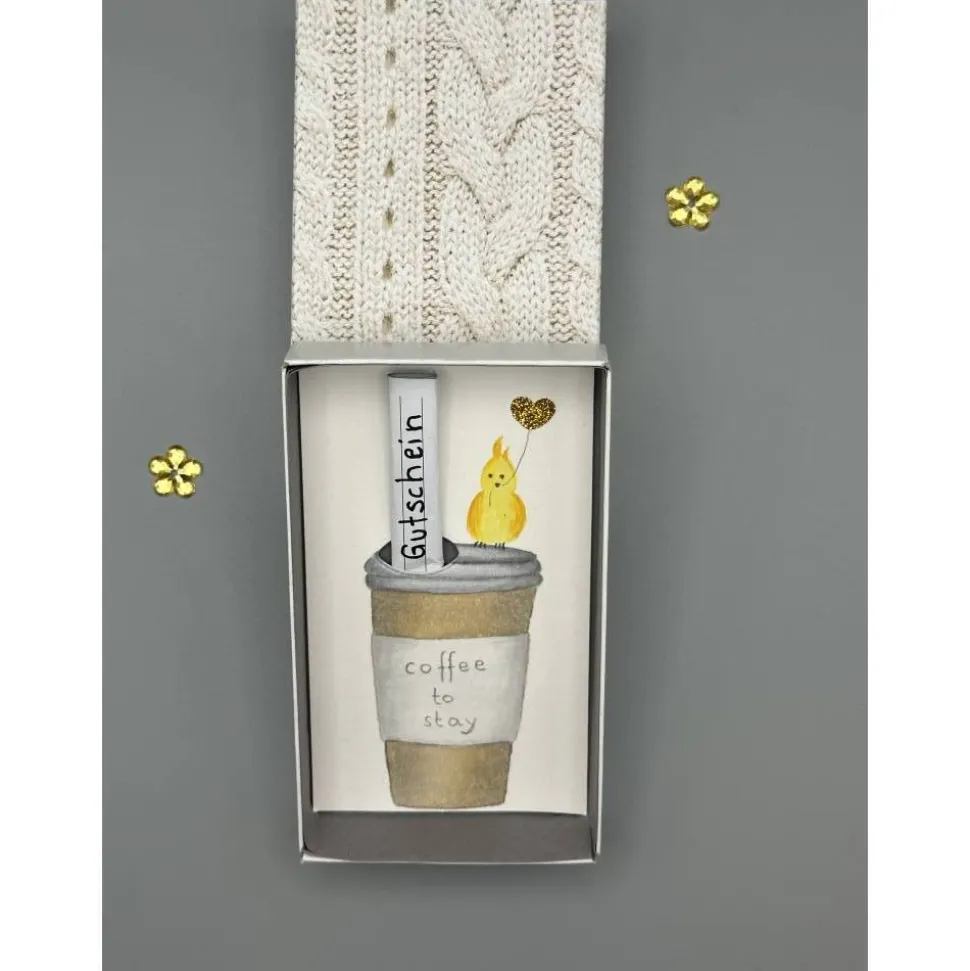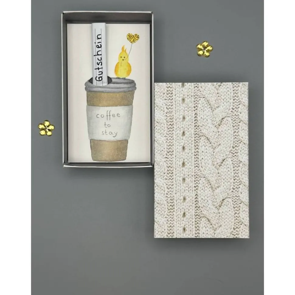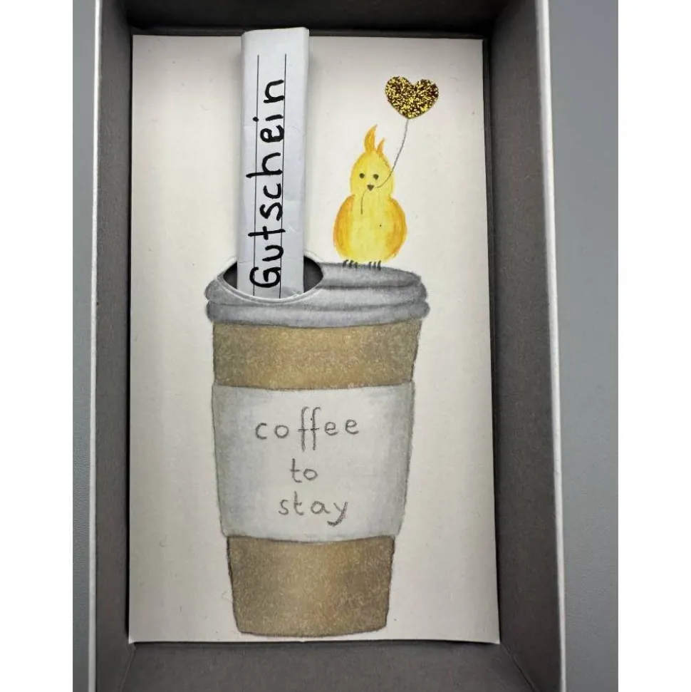Im Inneren findest du einen handgemalten Coffee-to-go-Becher, auf dem ein kleiner gelber Vogel mit Glitzer-Herzballon sitzt. Der Becher trägt die Aufschrift „Coffee to stay“ und besitzt an der typischen Stelle für den Strohhalm ein vorgestanztes Loch. Hier kannst du entweder einen Geldschein oder eine handgeschriebene Einladung ganz einfach einrollen und einstecken.