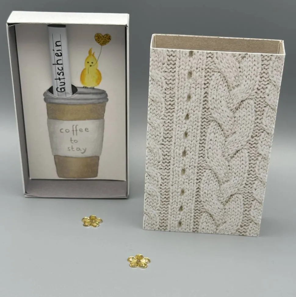 Die Außenseite der Box ist mit einem Motivpapier in Strickoptik beklebt, was ihr einen cozy Look verleiht und sofort Lust auf ein gemeinsames Käffchen macht.