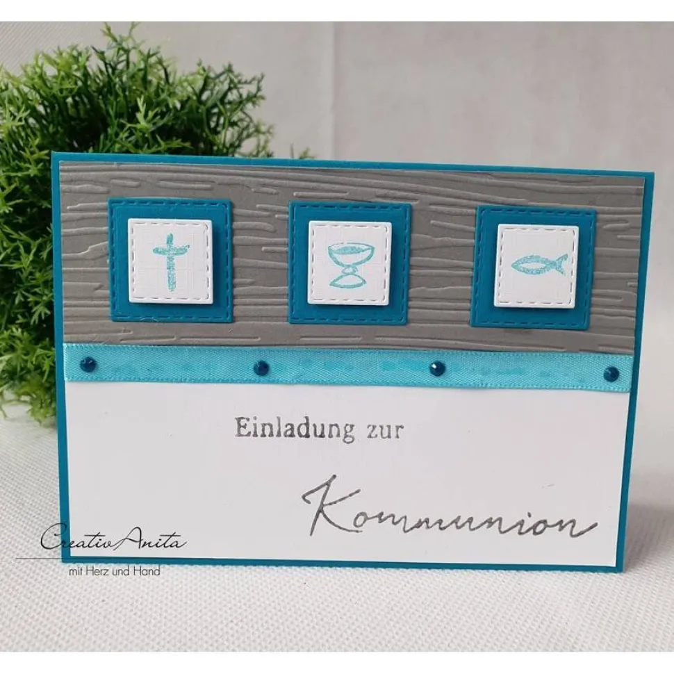 Material: Kartenkarton, Satinband, Stanzelemente inklusive Einlegeblatt und Umschlag